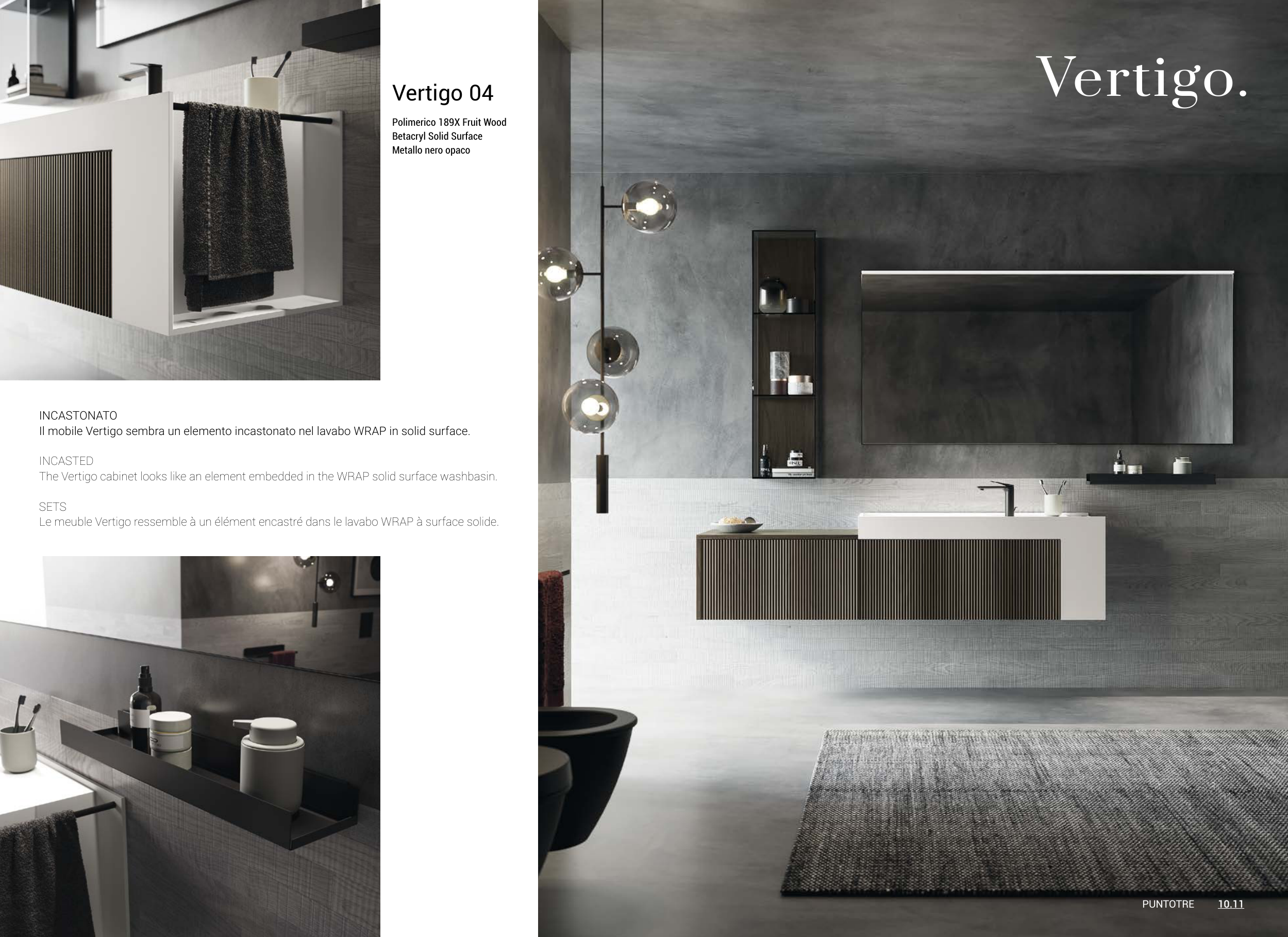Il mobile Vertigo sembra un elemento incastonato nel lavabo WRAP in solid surface.