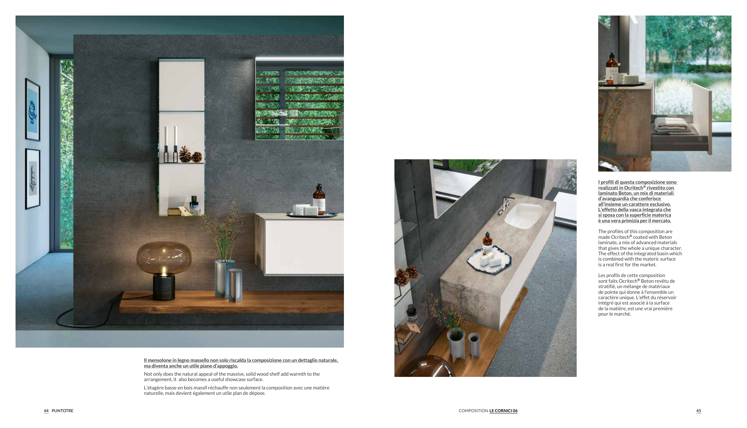 Il mensolone in legno massello non solo riscalda la composizione con un dettaglio naturale,