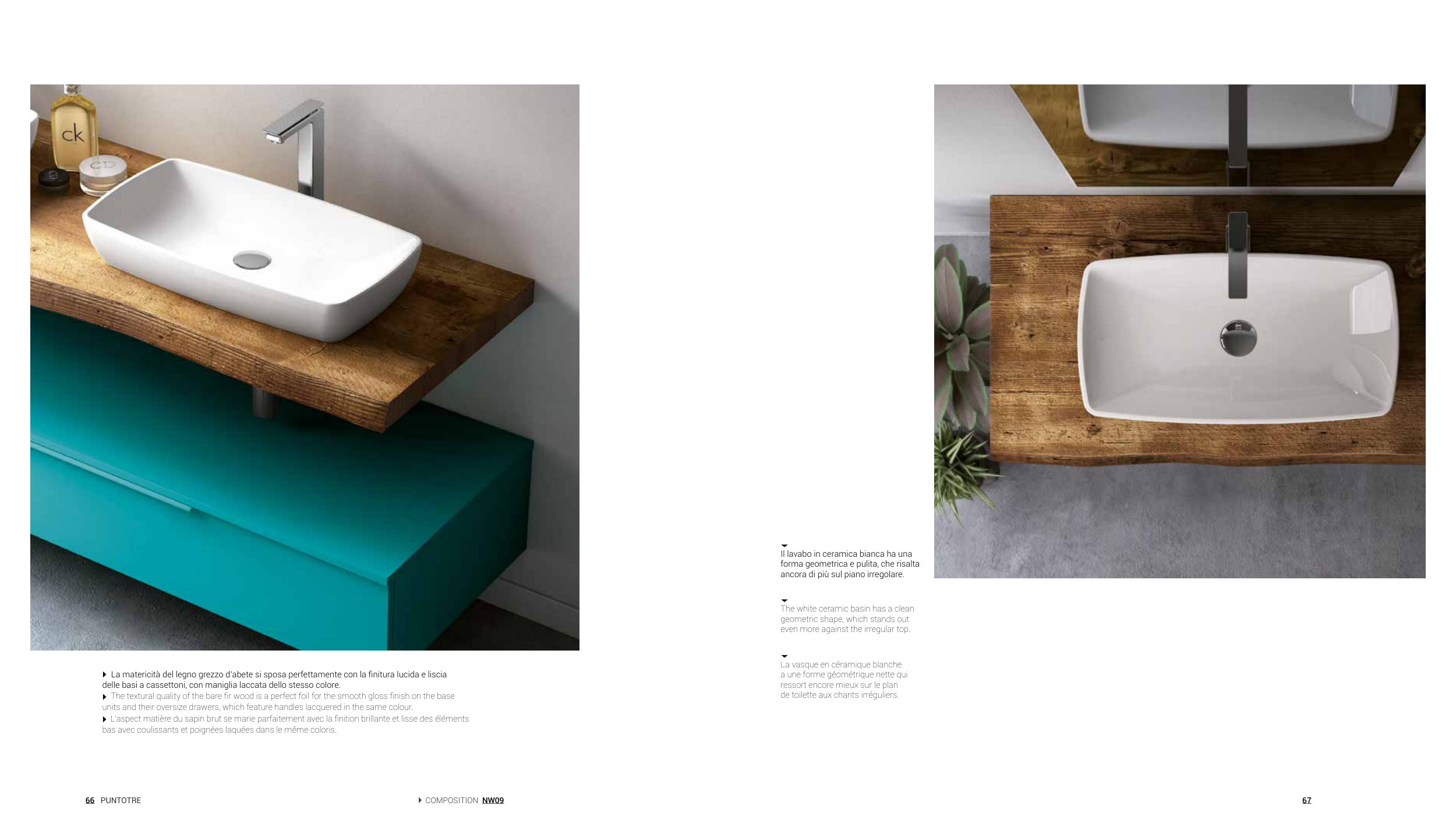 La matericità del legno grezzo d’abete si sposa perfettamente con la finitura lucida e liscia
