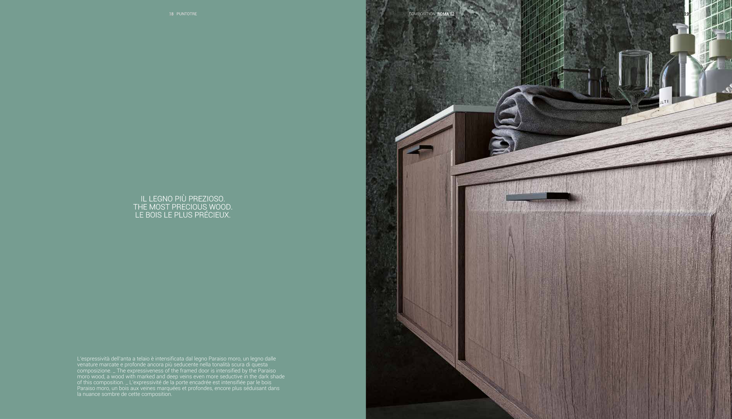 L’espressività dell’anta a telaio è intensificata dal legno Paraiso moro, un legno dalle