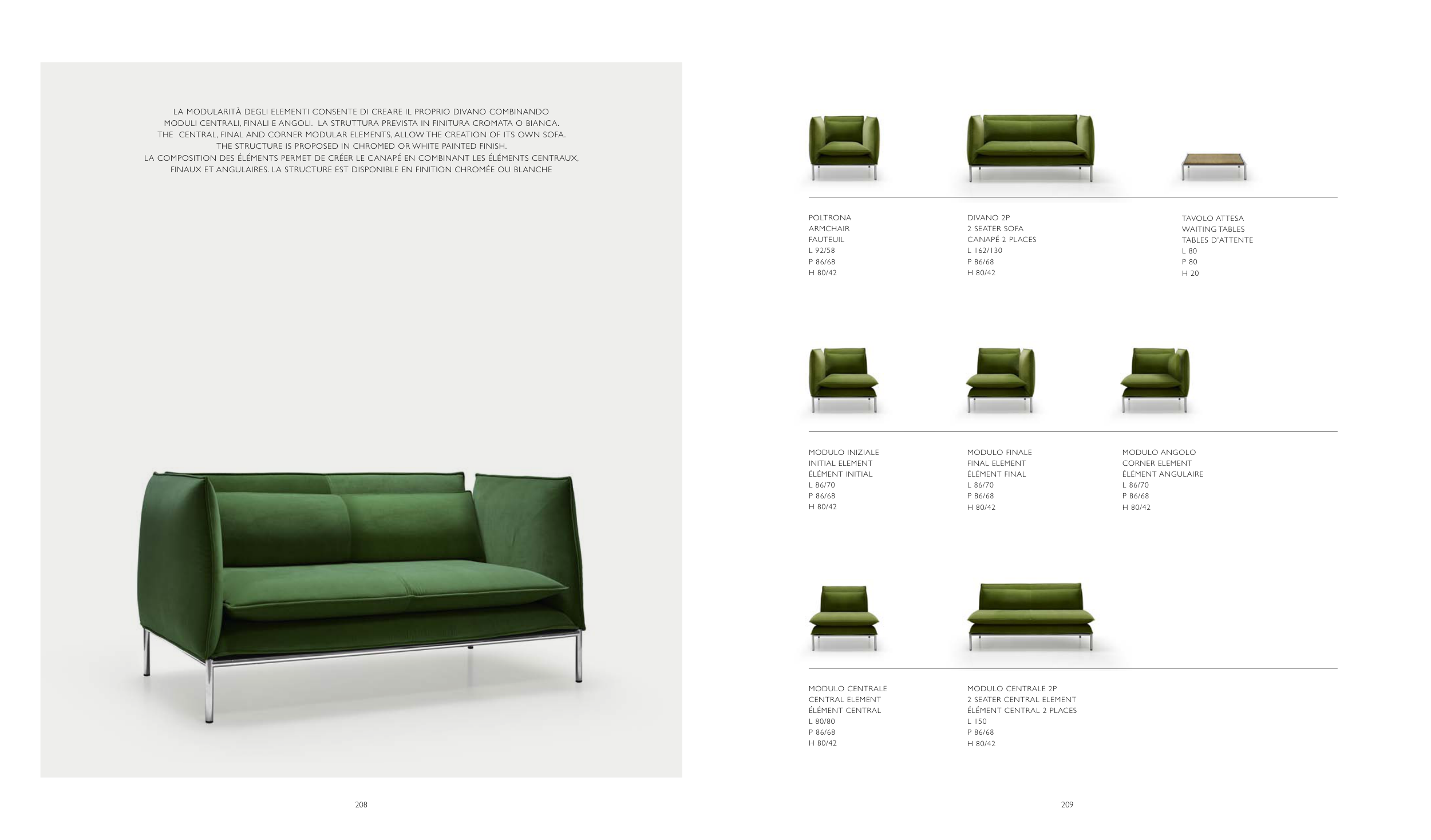 THE CENTRAL, FINAL AND CORNER MODULAR ELEMENTs, ALLOW THE CREATION OF ITs OWN sOFA.
