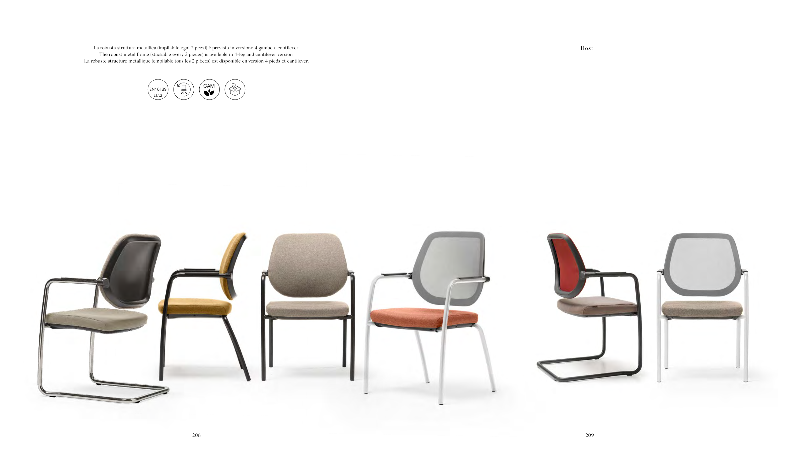 La robusta struttura metallica (impilabile ogni 2 pezzi) è prevista in versione 4 gambe e cantilever.