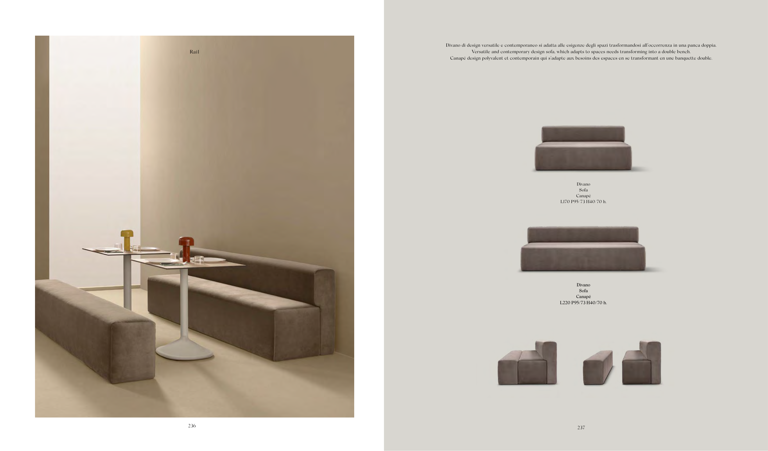 Versatile and contemporary design sofa, which adapts to spaces needs transforming into a double bench.