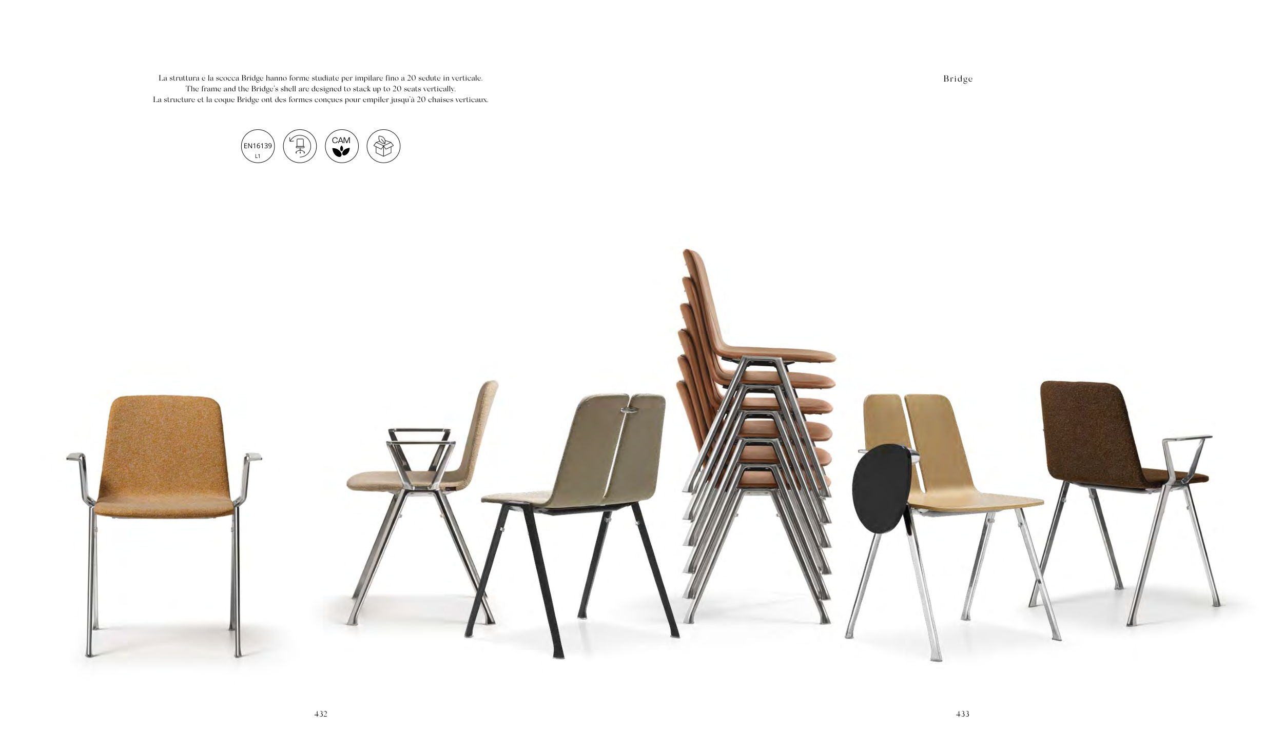 La struttura e la scocca Bridge hanno forme studiate per impilare fino a 20 sedute in verticale.