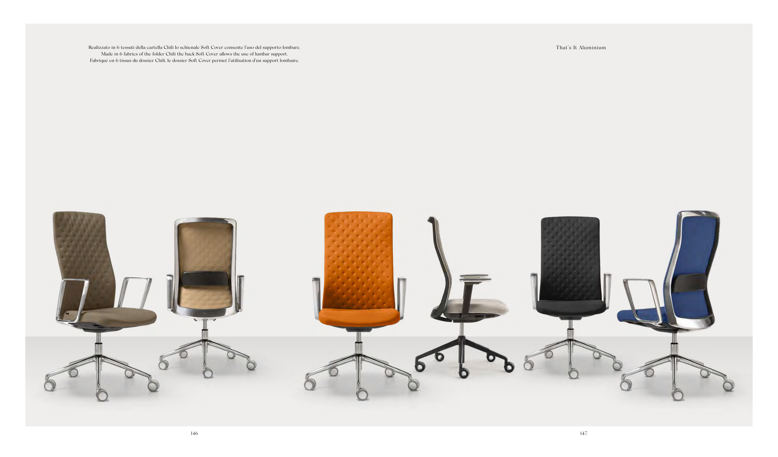 Realizzato in 6 tessuti della cartella Chili lo schienale Soft Cover consente l’uso del supporto lombare.