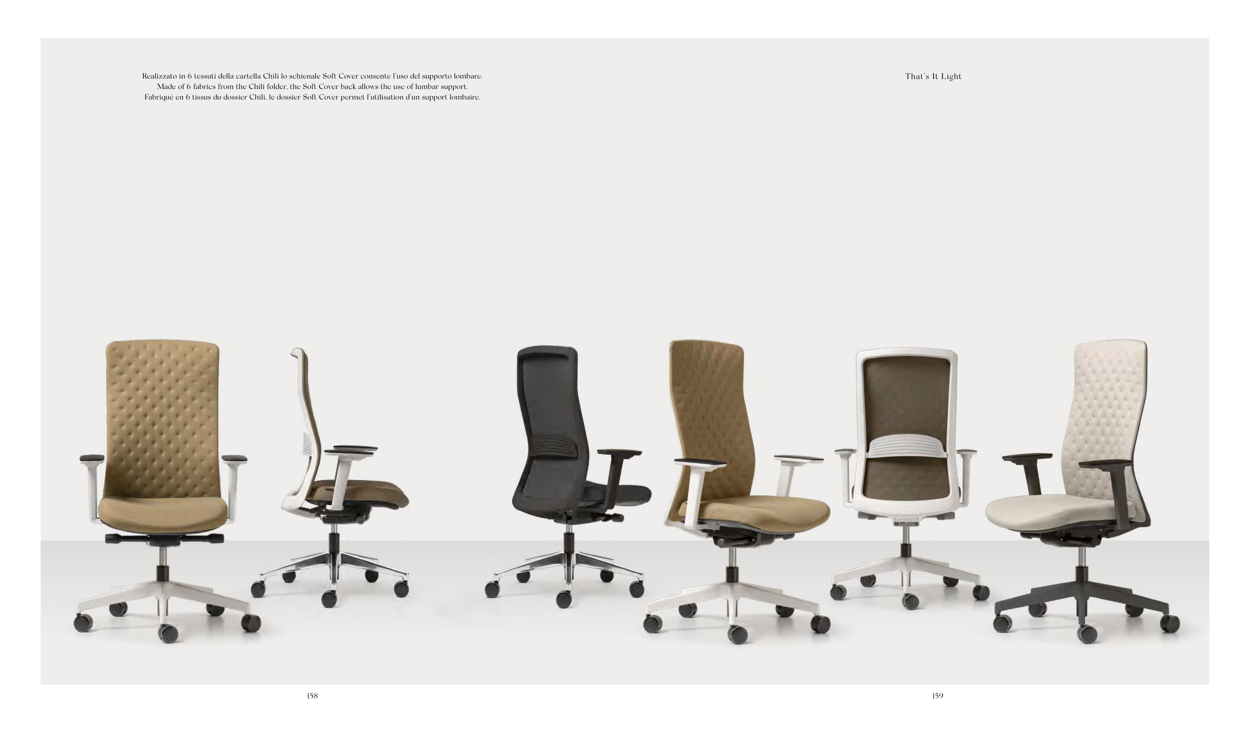 Realizzato in 6 tessuti della cartella Chili lo schienale Soft Cover consente l’uso del supporto lombare.