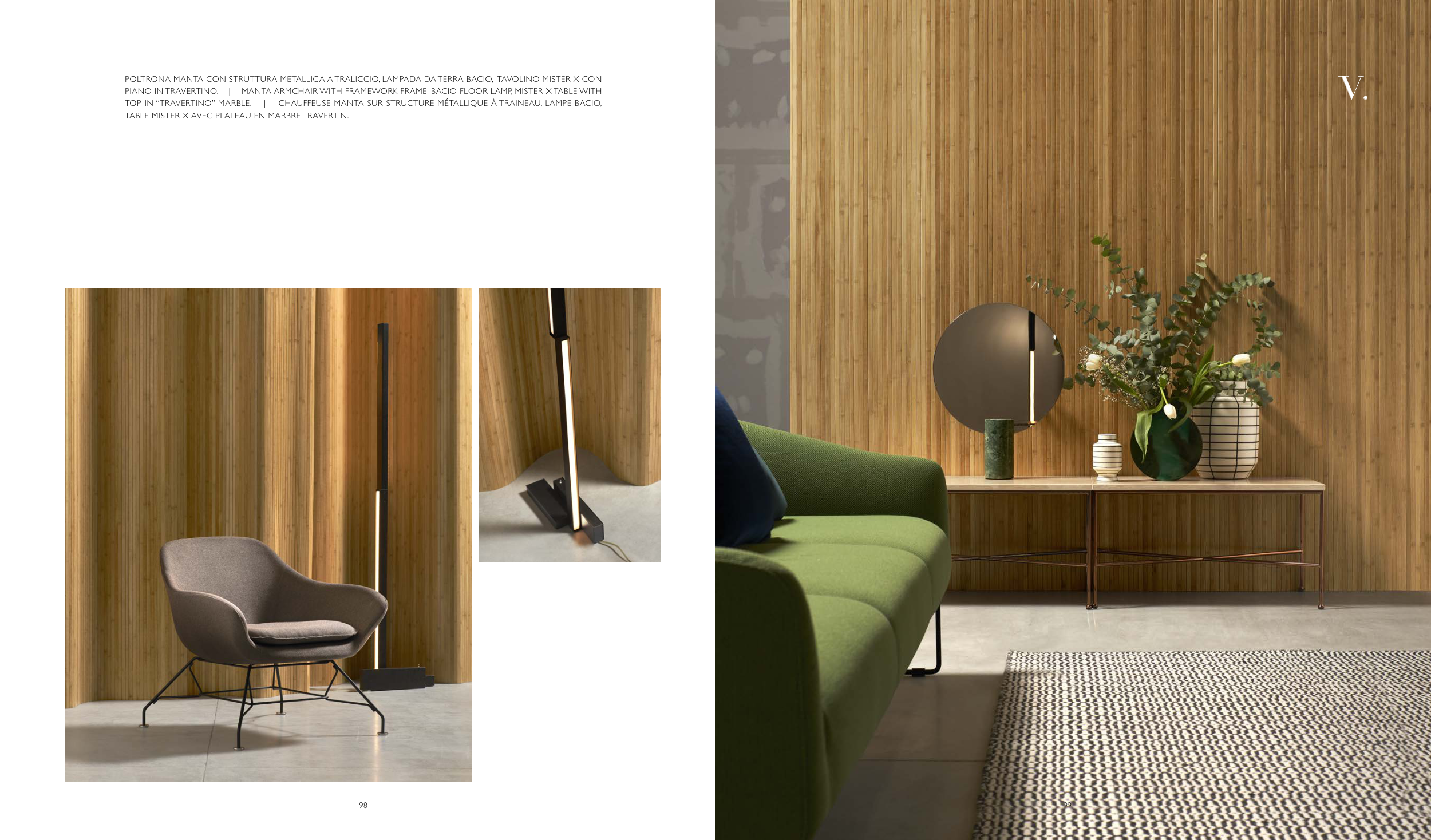 PIANO IN TRAVERTINO. | MANTA ARMCHAIR WITH FRAMEWORK FRAME, BACIO FLOOR LAMP, MISTER X TABLE WITH