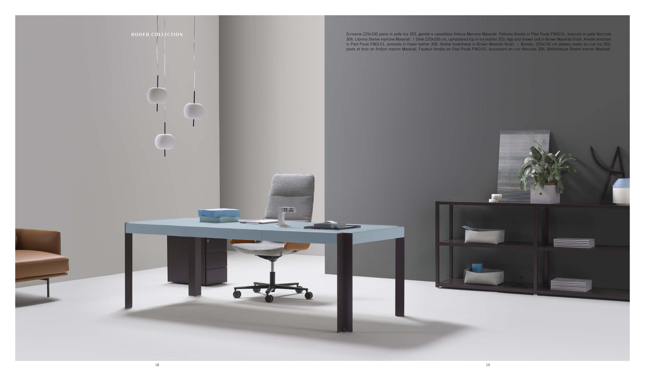 scrivania 225x100 piano in pelle Ice 353, gambe e cassettiera finitura Marrone Maserati. Poltrona Amelie in Pied Poule F963.01, braccioli in pelle nocciola