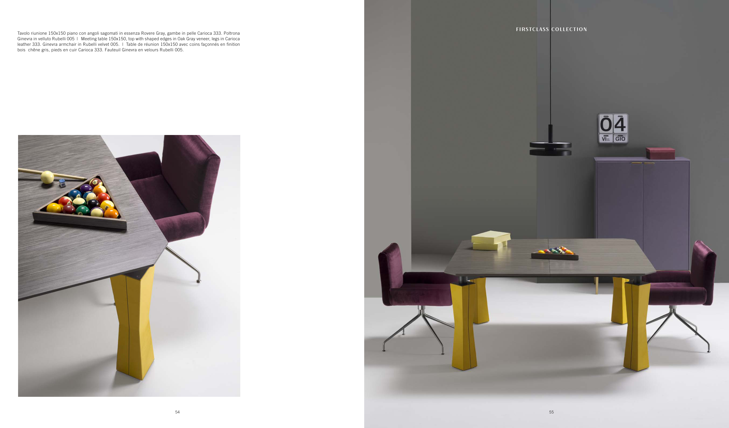 bois chêne gris, pieds en cuir Carioca 333. Fauteuil Ginevra en velours Rubelli 005.