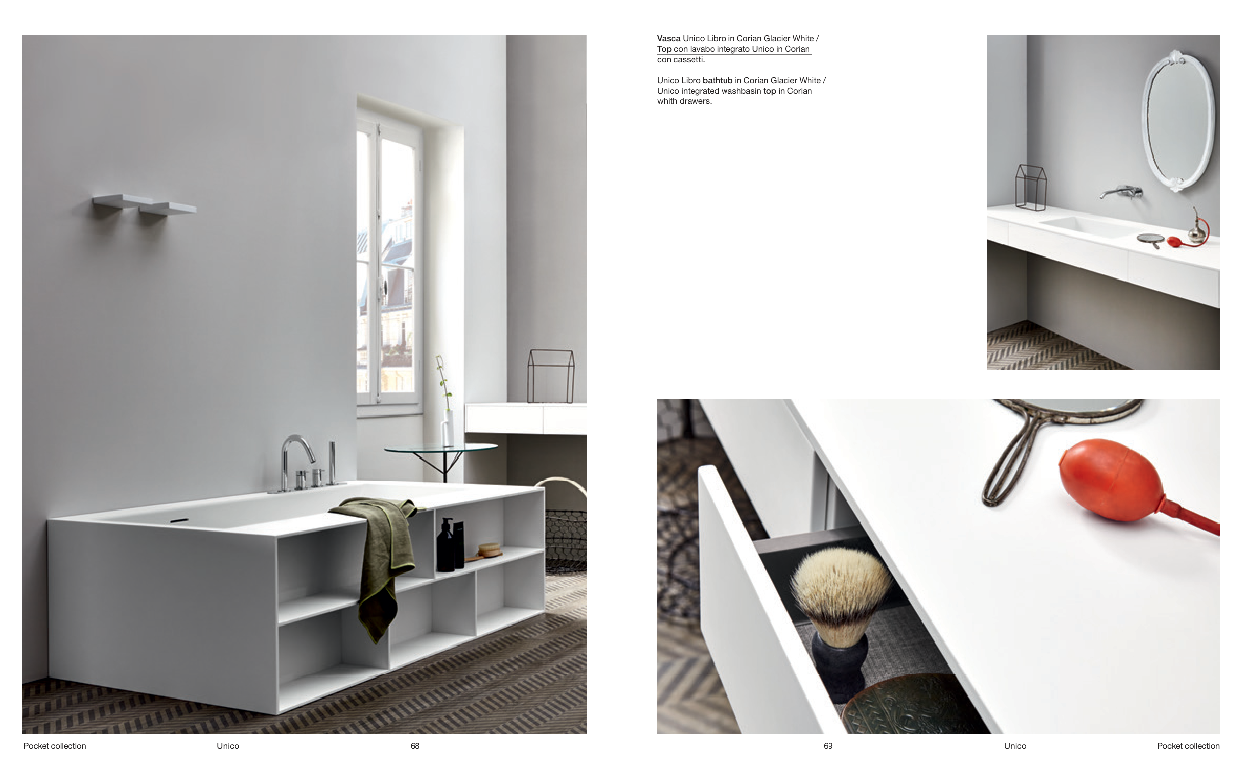 Vasca Unico Libro in Corian Glacier White / Top con lavabo integrato Unico in Corian con cassetti. Unico Libro bathtub in Corian Glacier White / Unico integrated washbasin top in Corian whith drawers. Pocket collection Pocket collection 68 69 Unico Unico
