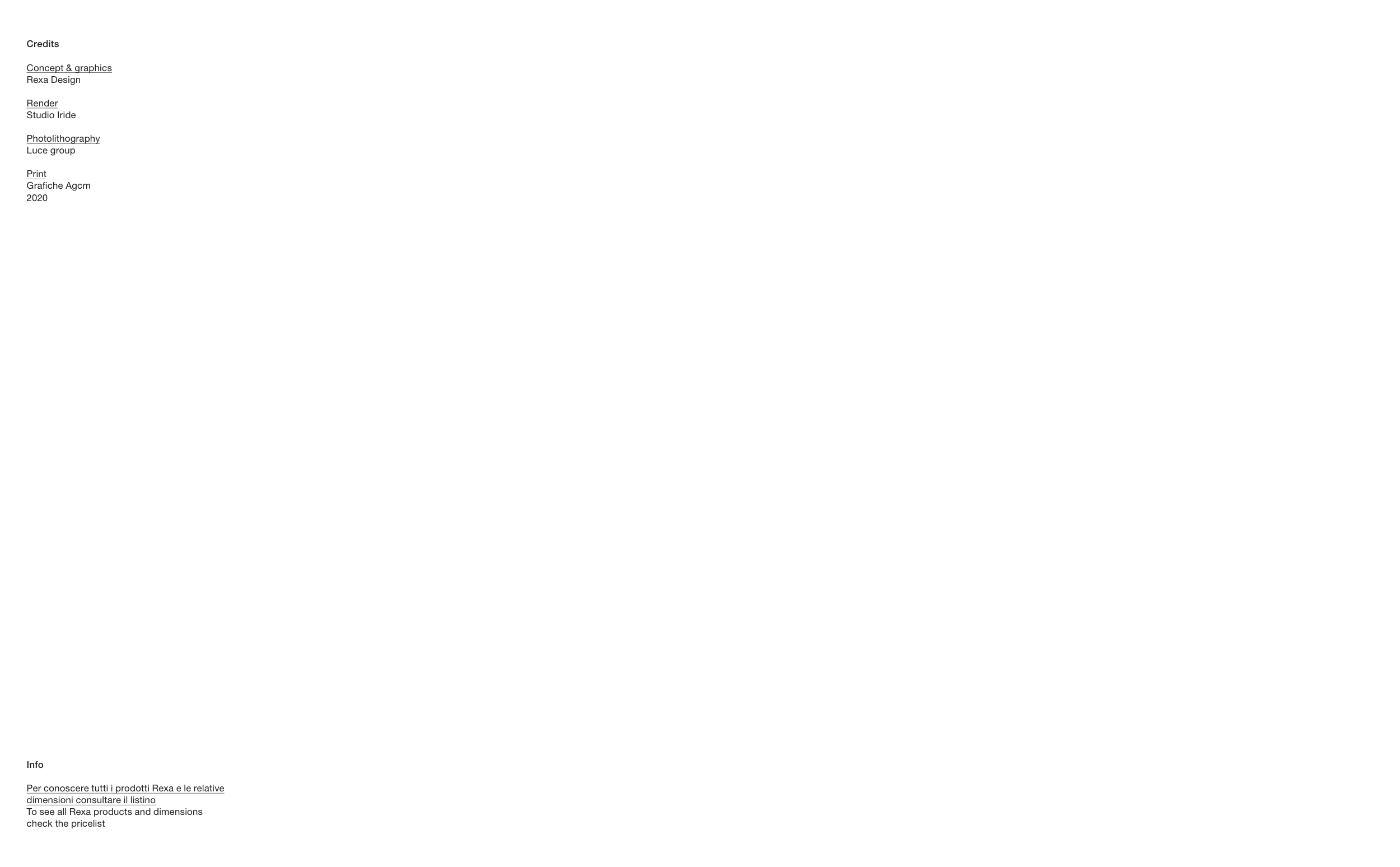 Credits Concept & graphics Rexa Design Render Studio Iride Photolithography Luce group Print Grafche Agcm 2020 Info Per conoscere tutti i prodotti Rexa e le relative dimensioni consultare il listino To see all Rexa products and dimensions check the pricelist