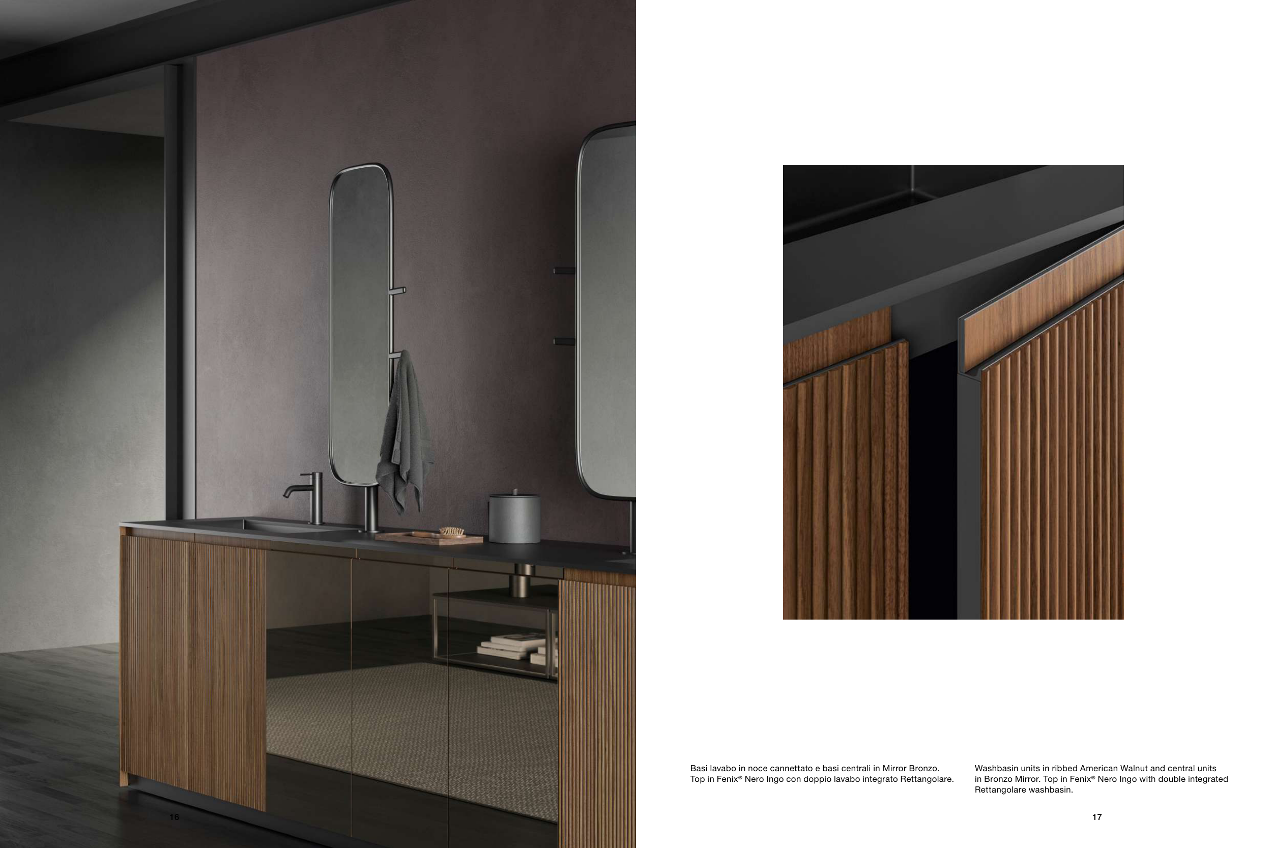 Basi lavabo in noce cannettato e basi centrali in Mirror Bronzo.