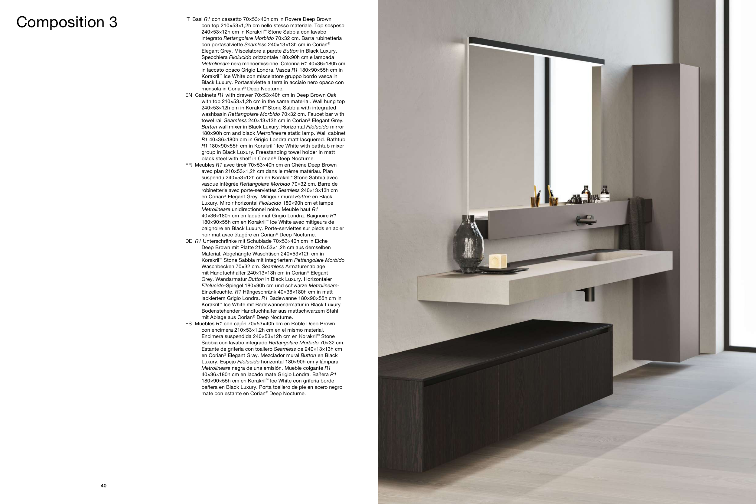 en Corian® Elegant Grey. Mitigeur mural Button en Black