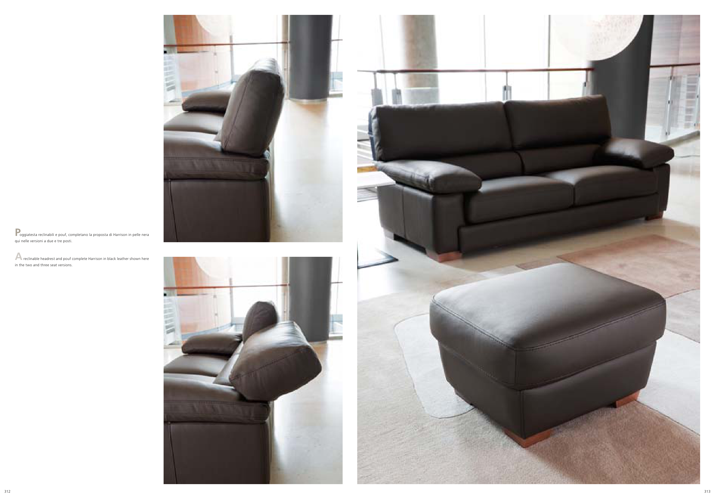 Poggiatesta reclinabili e pouf, completano la proposta di Harrison in pelle nera