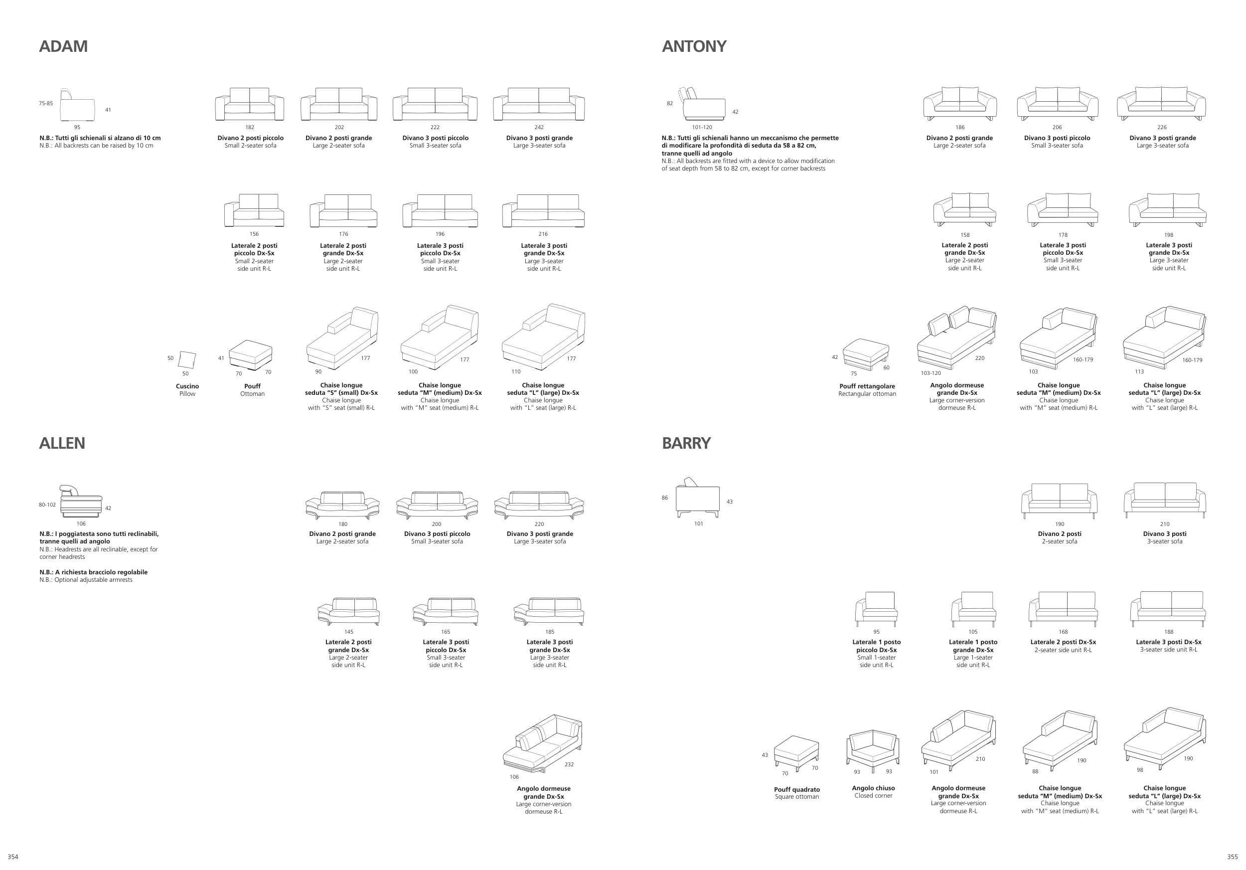N.B.: Tutti gli schienali si alzano di 10 cm