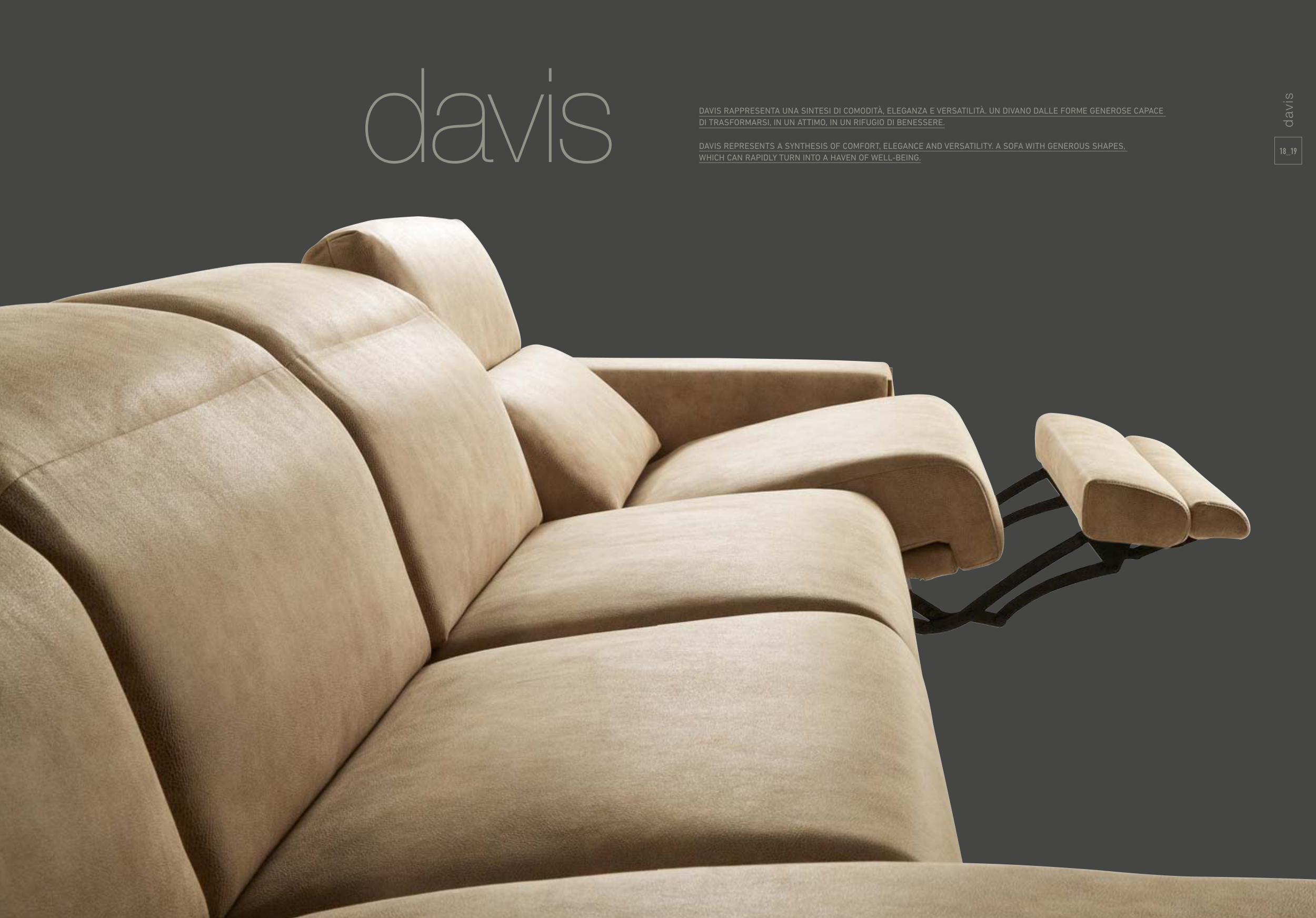 DAVIS REPRESENTS A SYNTHESIS OF COMFORT, ELEGANCE AND VERSATILITY. A SOFA WITH GENEROUS SHAPES,
