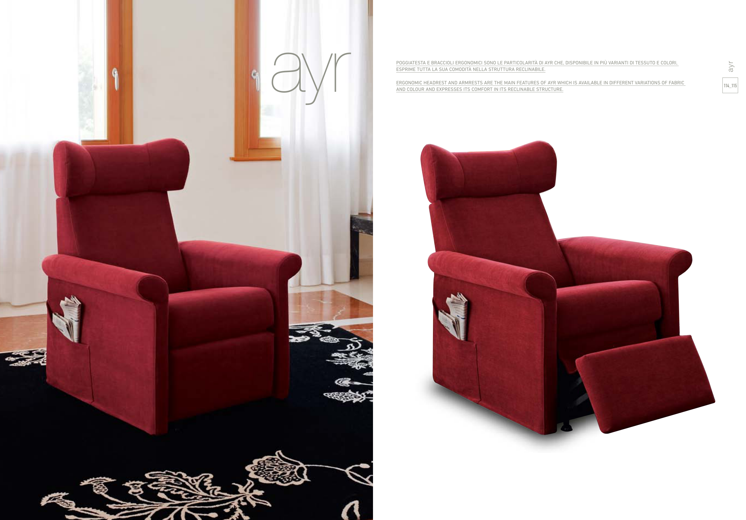 POGGIATESTA E BRACCIOLI ERGONOMICI SONO LE PARTICOLARITÀ DI AYR CHE, DISPONIBILE IN PIÙ VARIANTI DI TESSUTO E COLORI,