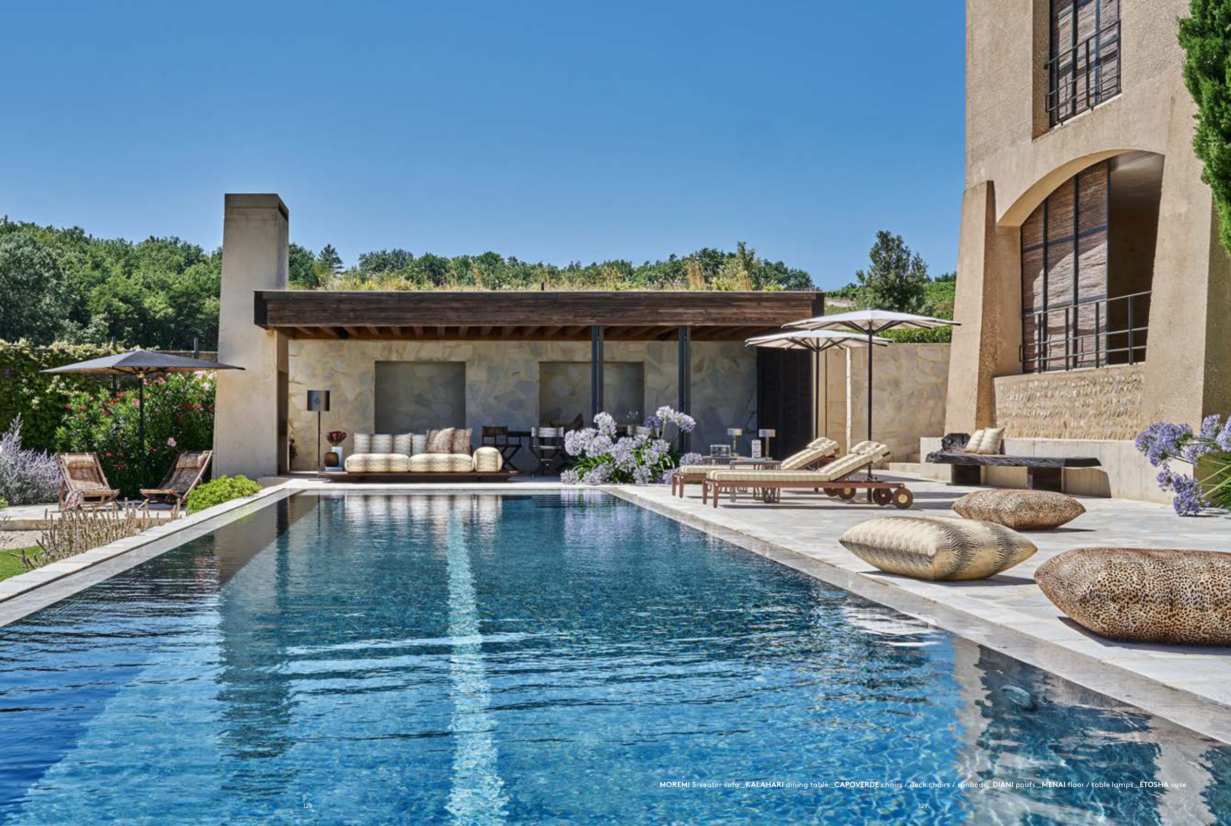 MOREMI 3-seater sofa_KALAHARI dining table_CAPOVERDE chairs / deck chairs / sunbeds_DIANI poufs_MENAI floor / table lamps_ETOSHA vase