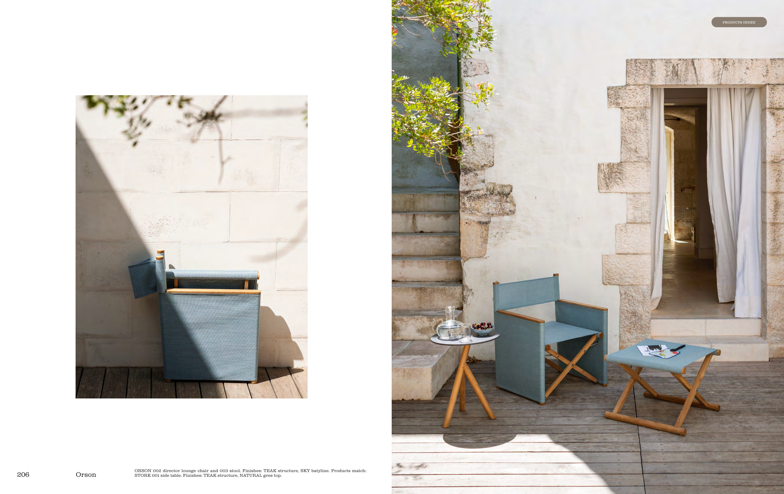 ORSON 002 director lounge chair and 003 stool. Finishes: TEAK structure, SKY batyline. Products match: