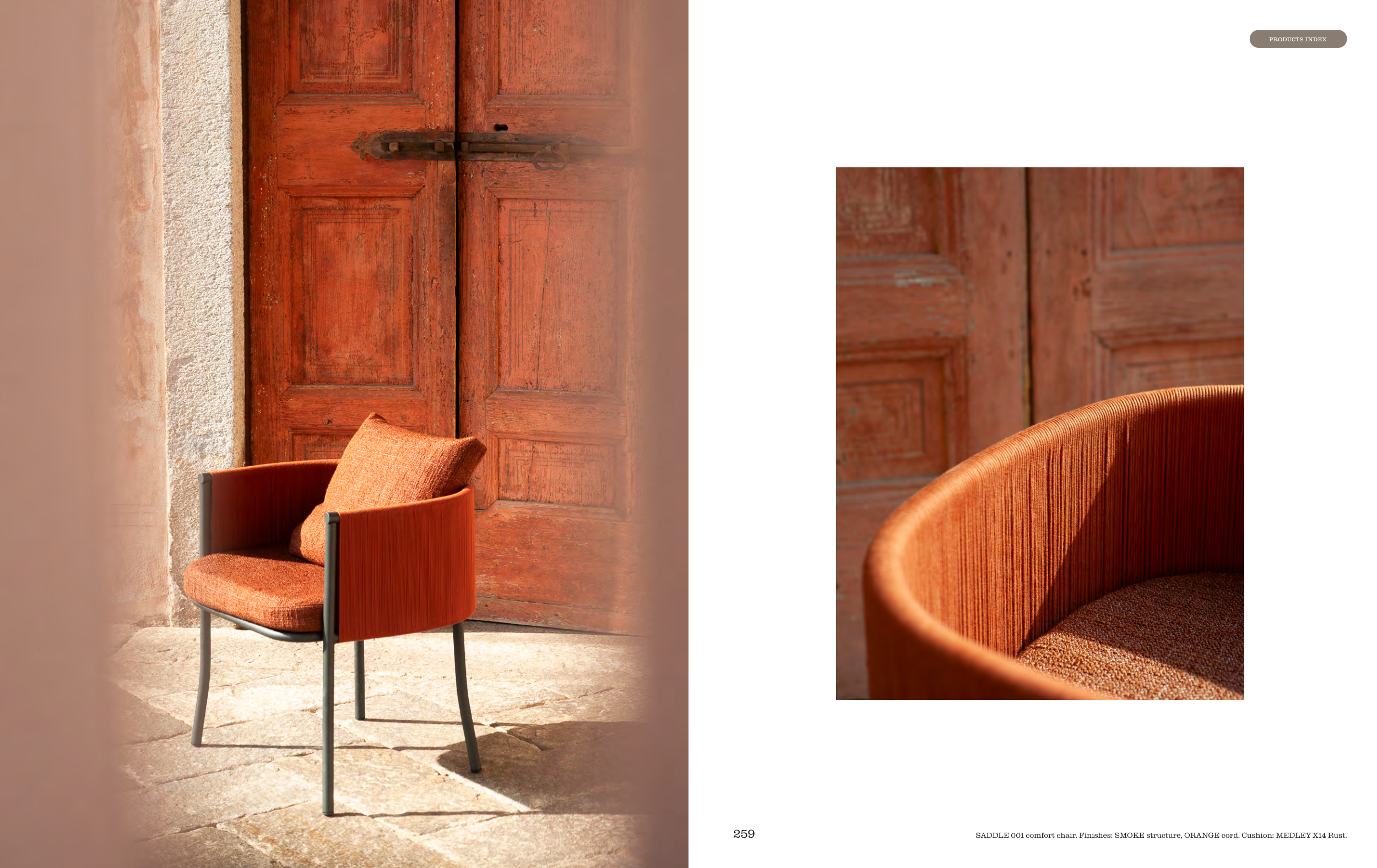 SADDLE 001 comfort chair. Finishes: SMOKE structure, ORANGE cord. Cushion: MEDLEY X14 Rust.