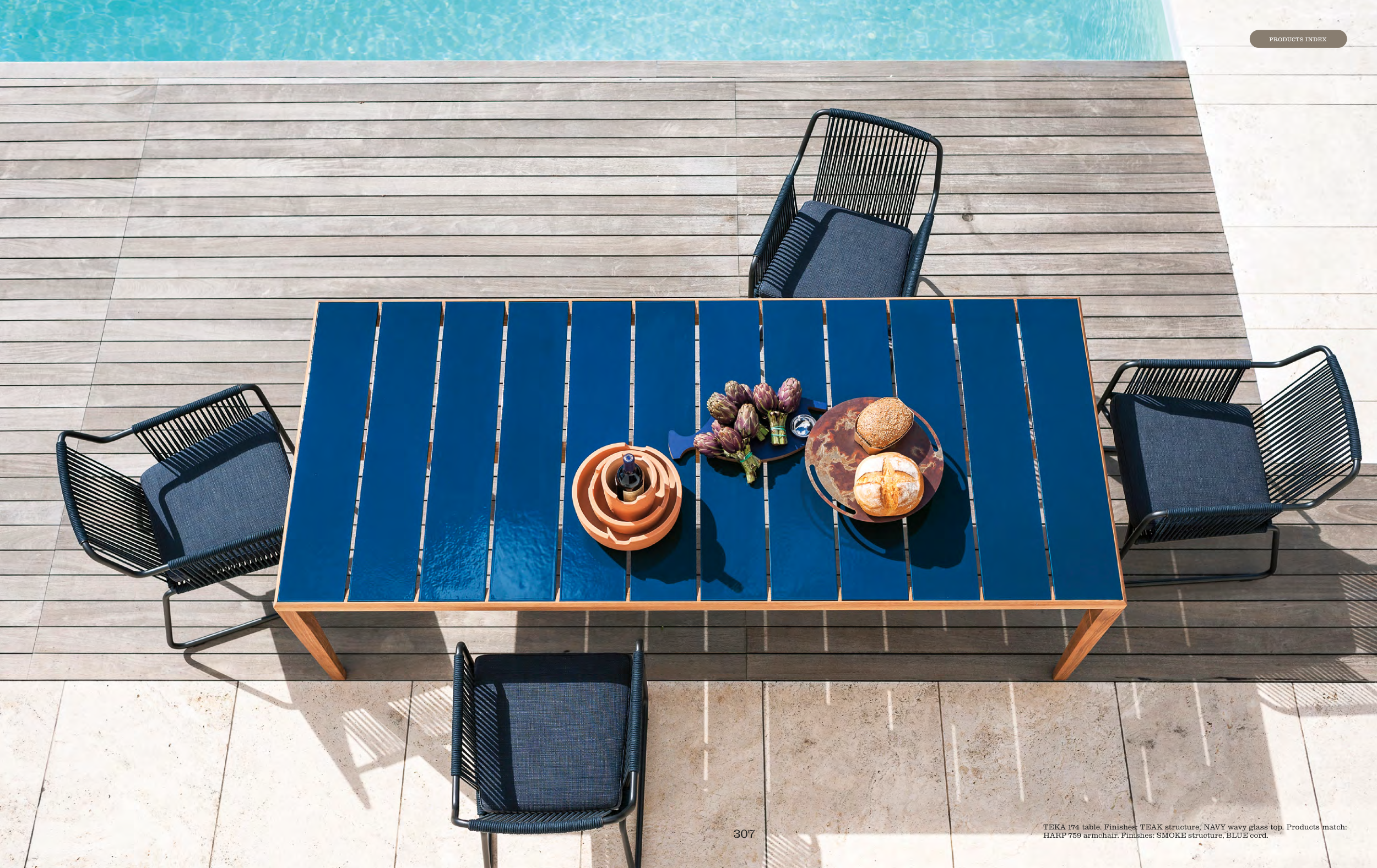 TEKA 174 table. Finishes: TEAK structure, NAVY wavy glass top. Products match: