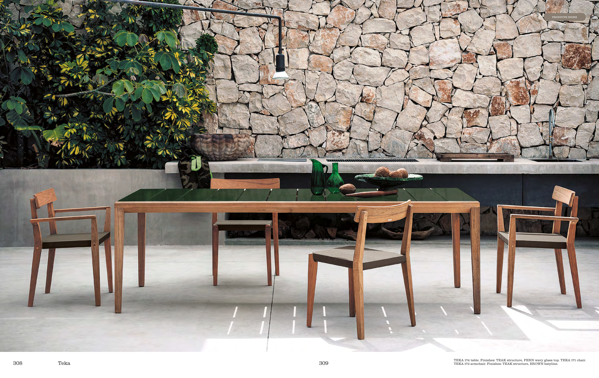 TEKA 174 table. Finishes: TEAK structure, FERN wavy glass top. TEKA 171 chair.