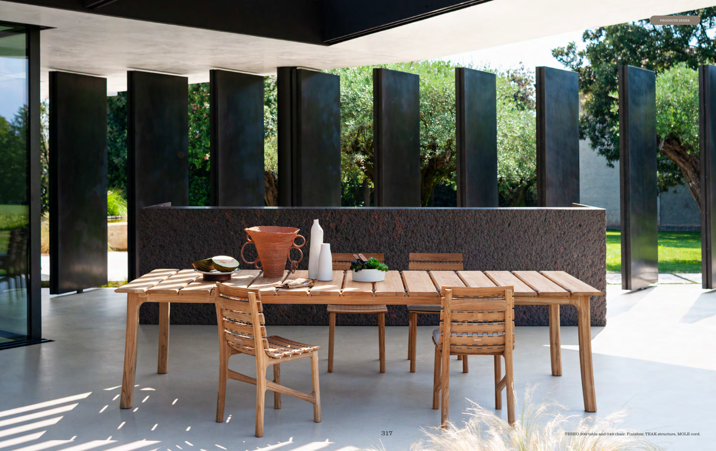 TESEO 300 table and 049 chair. Finishes: TEAK structure, MOLE cord.