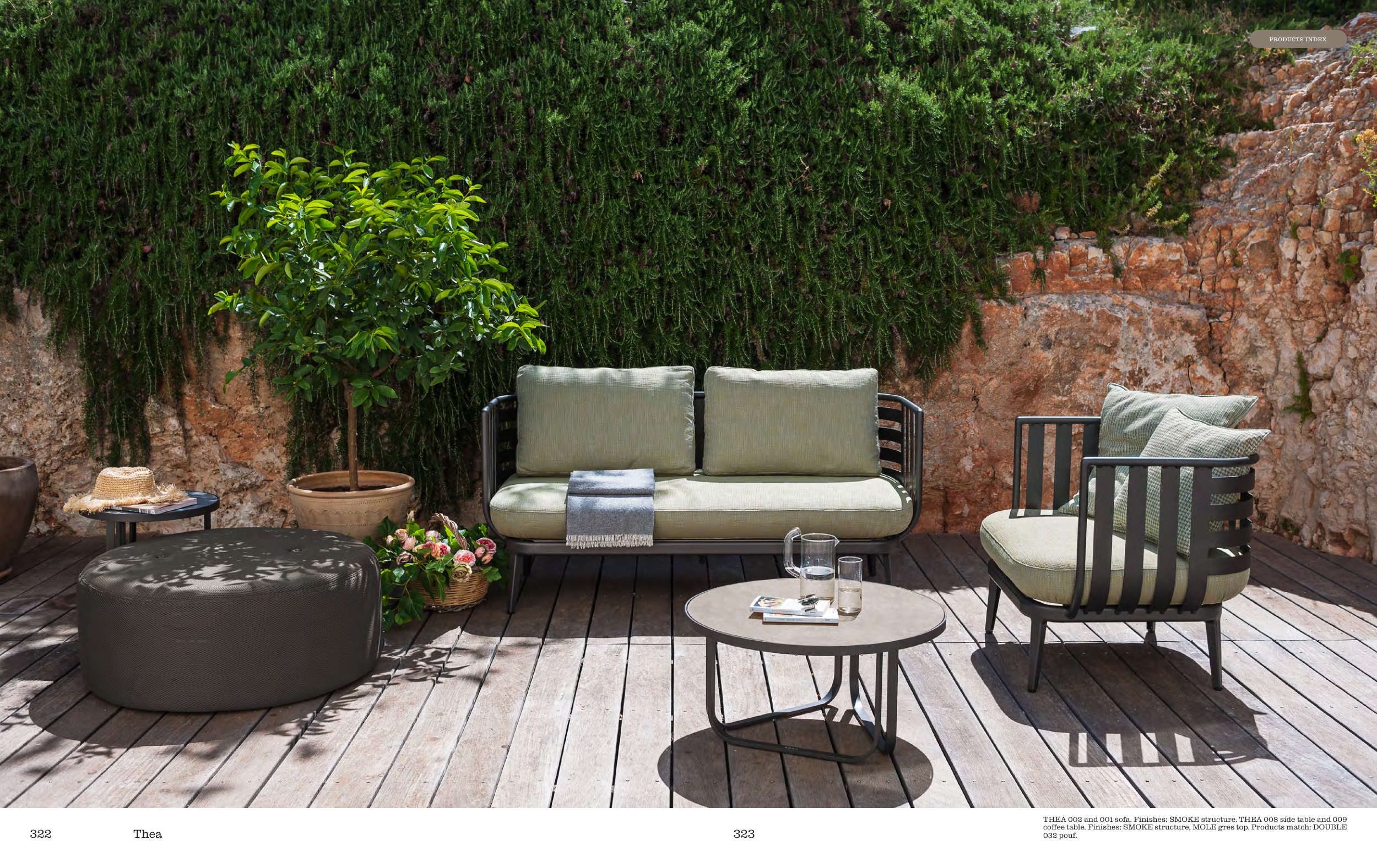 THEA 002 and 001 sofa. Finishes: SMOKE structure. THEA 008 side table and 009