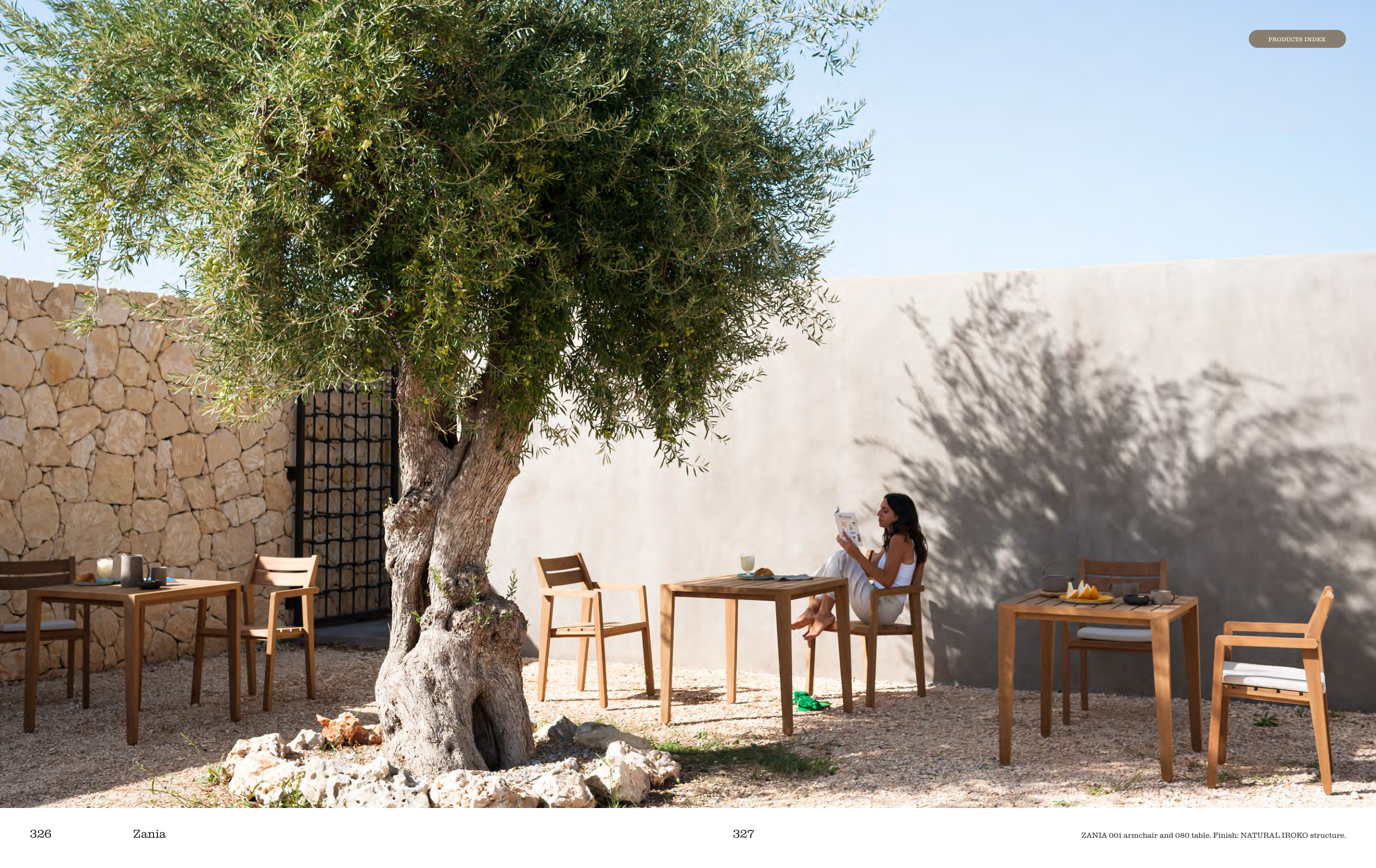 ZANIA 001 armchair and 080 table. Finish: NATURAL IROKO structure.