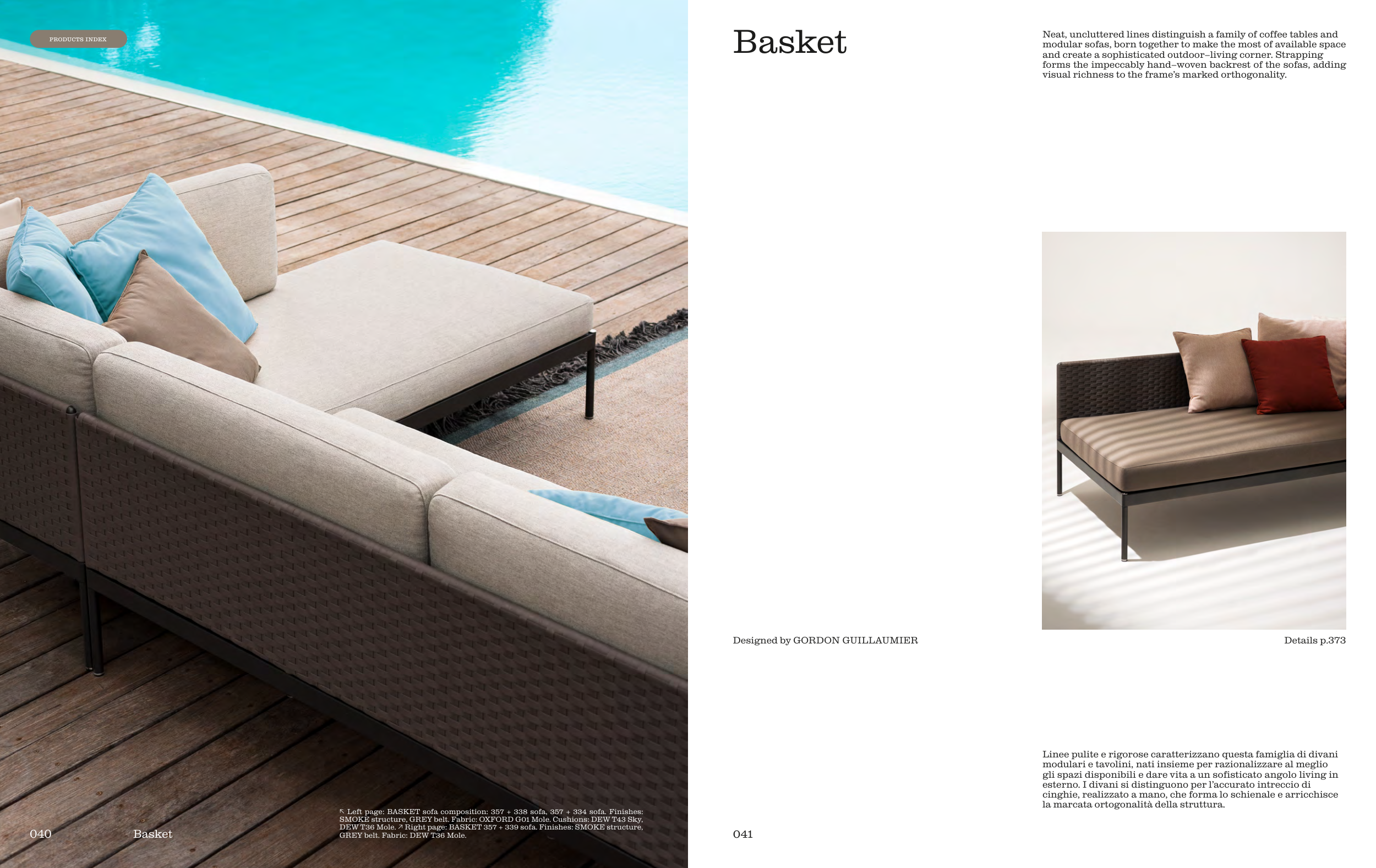 DEW T36 Mole. ↗ Right page: BASKET 357 + 339 sofa. Finishes: SMOKE structure,