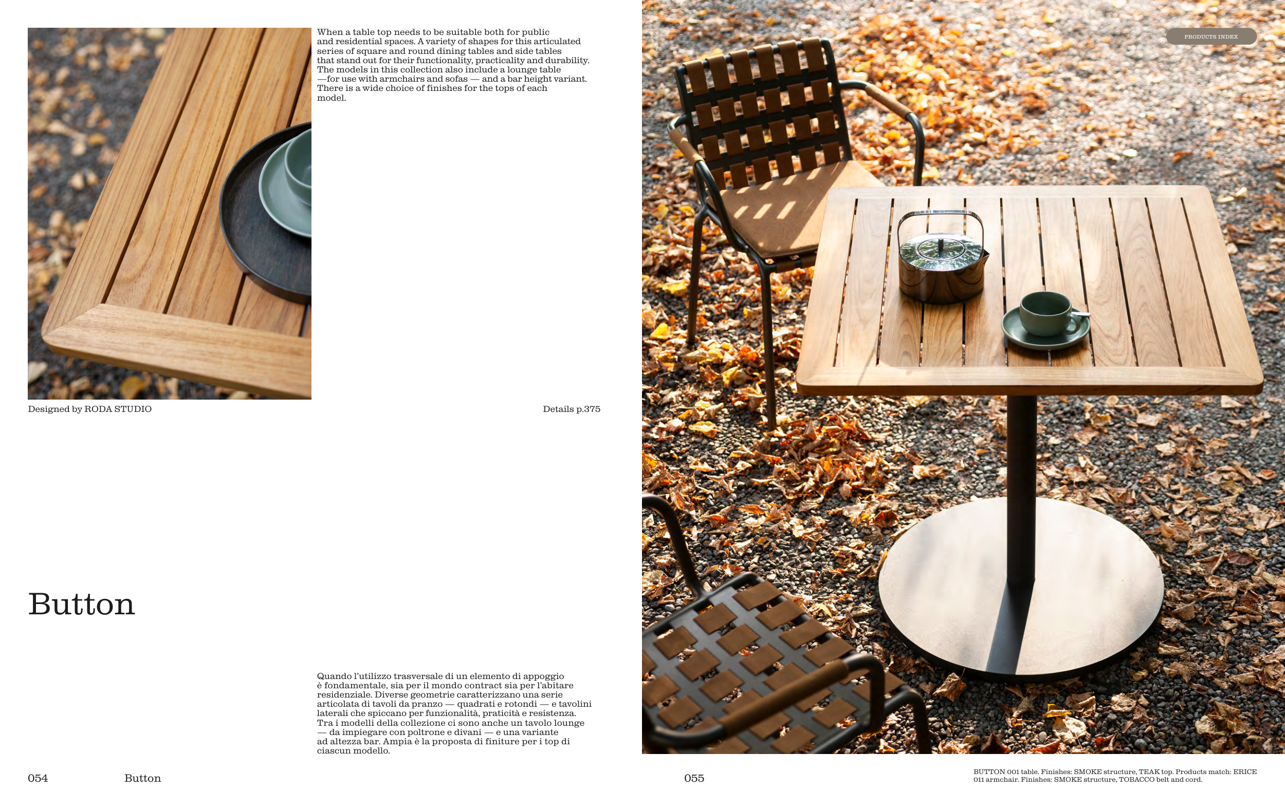 BUTTON 001 table. Finishes: SMOKE structure, TEAK top. Products match: ERICE