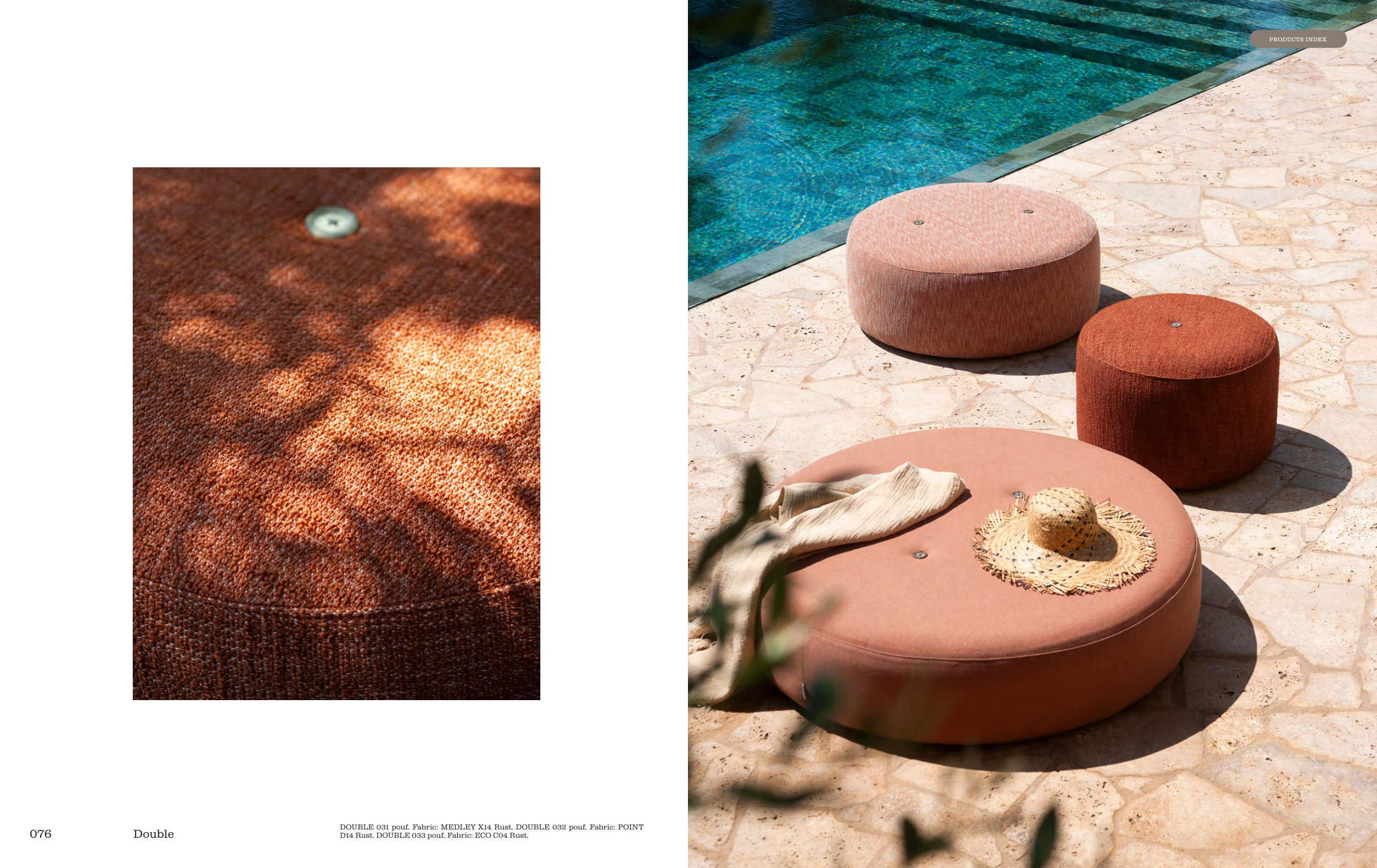 DOUBLE 031 pouf. Fabric: MEDLEY X14 Rust. DOUBLE 032 pouf. Fabric: POINT