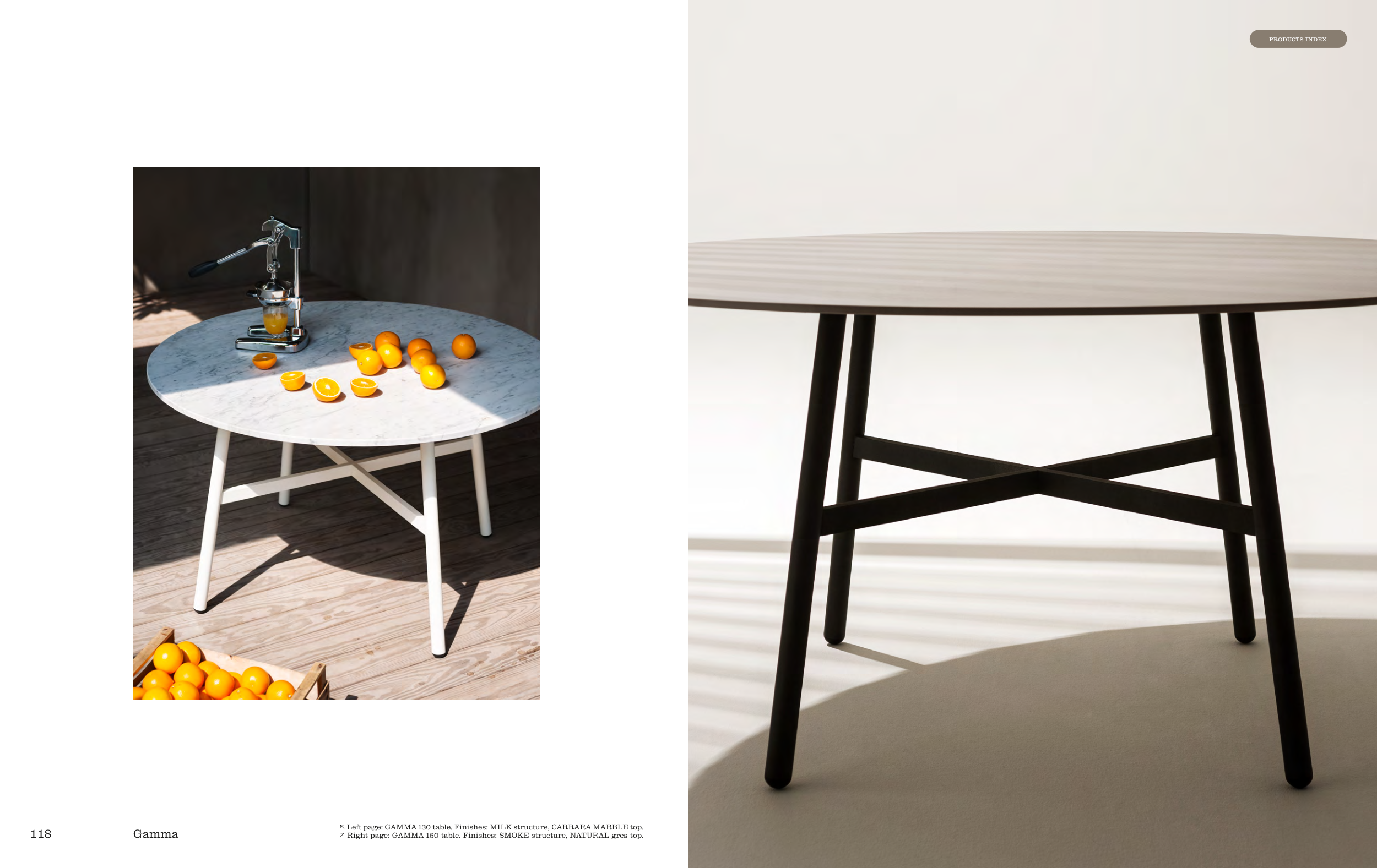 ↗ Right page: GAMMA 160 table. Finishes: SMOKE structure, NATURAL gres top.