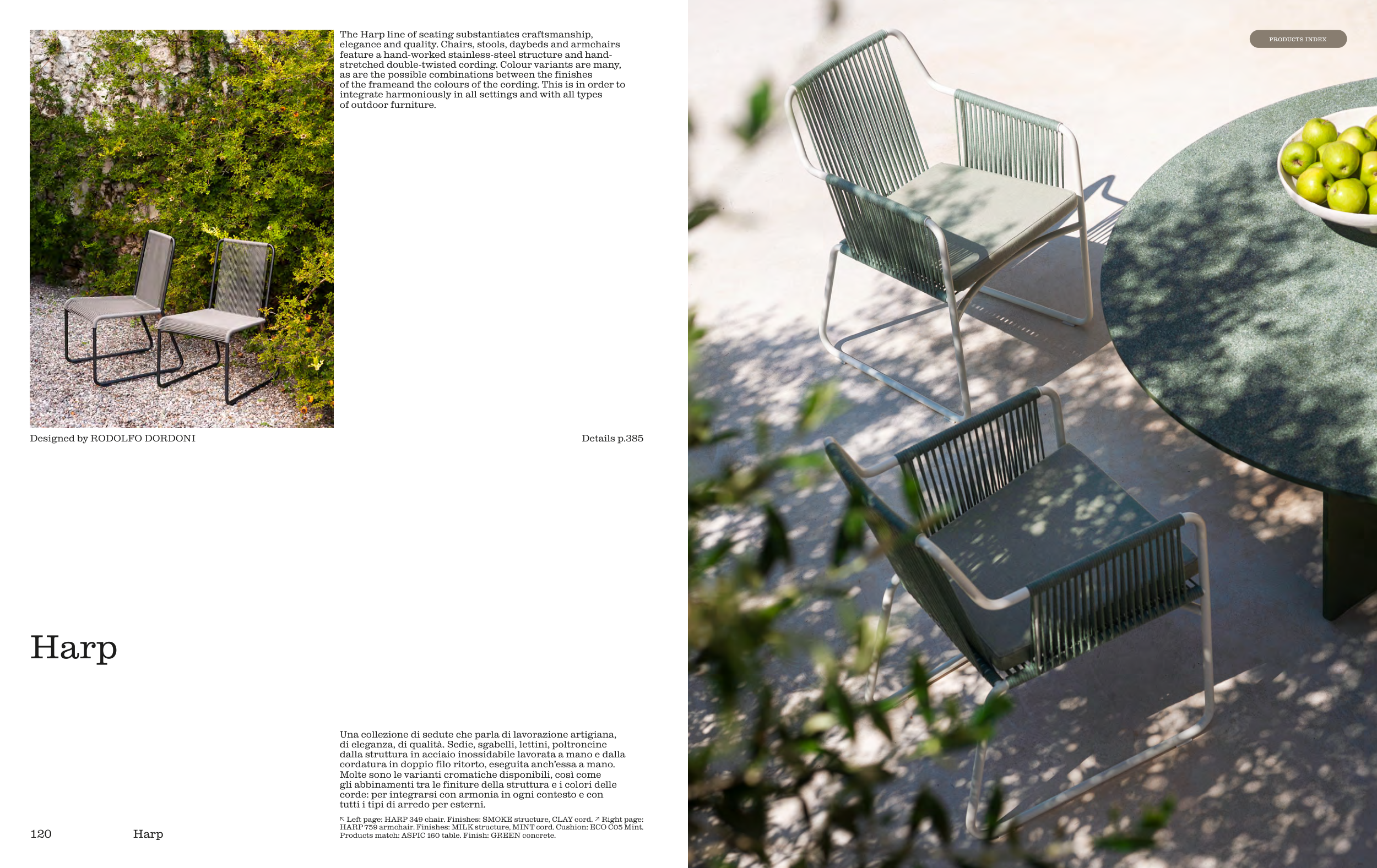 ↖ Left page: HARP 349 chair. Finishes: SMOKE structure, CLAY cord. ↗ Right page: