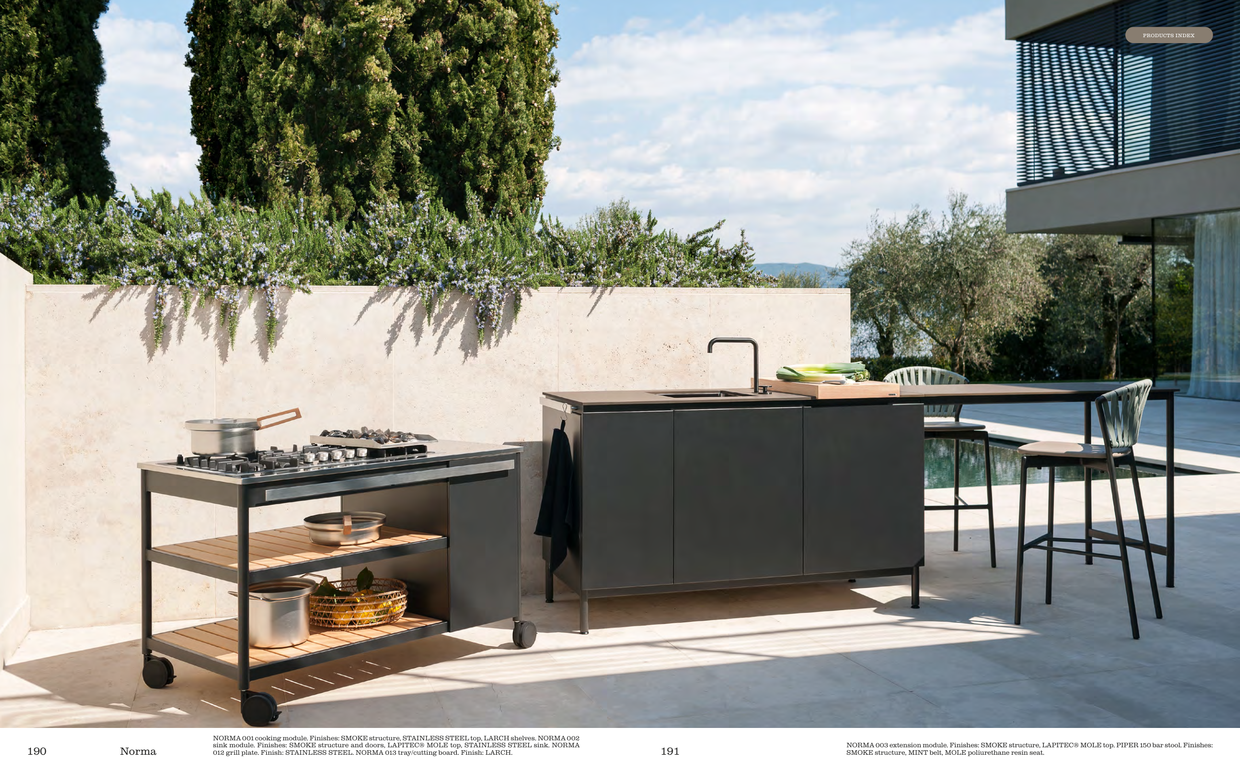NORMA 003 extension module. Finishes: SMOKE structure, LAPITEC® MOLE top. PIPER 150 bar stool. Finishes: