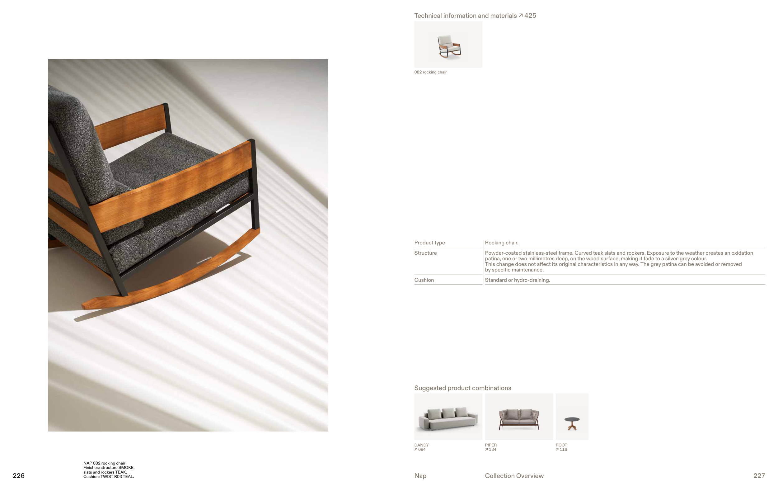 Powder-coated stainless-steel frame. Curved teak slats and rockers. Exposure to the weather creates an oxidation
