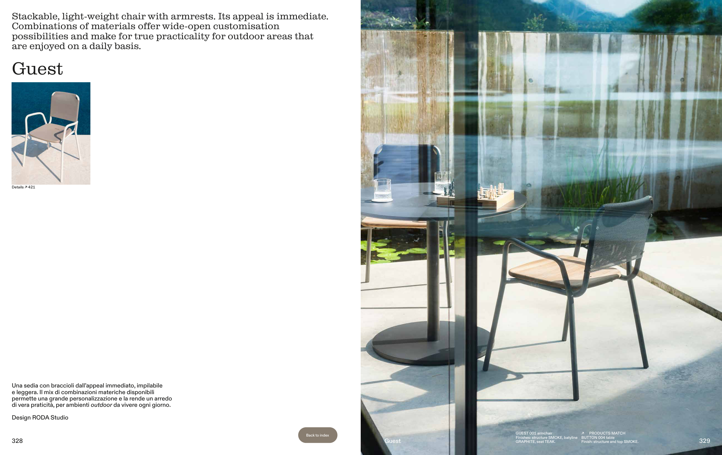 Stackable, light-weight chair with armrests. Its appeal is immediate.