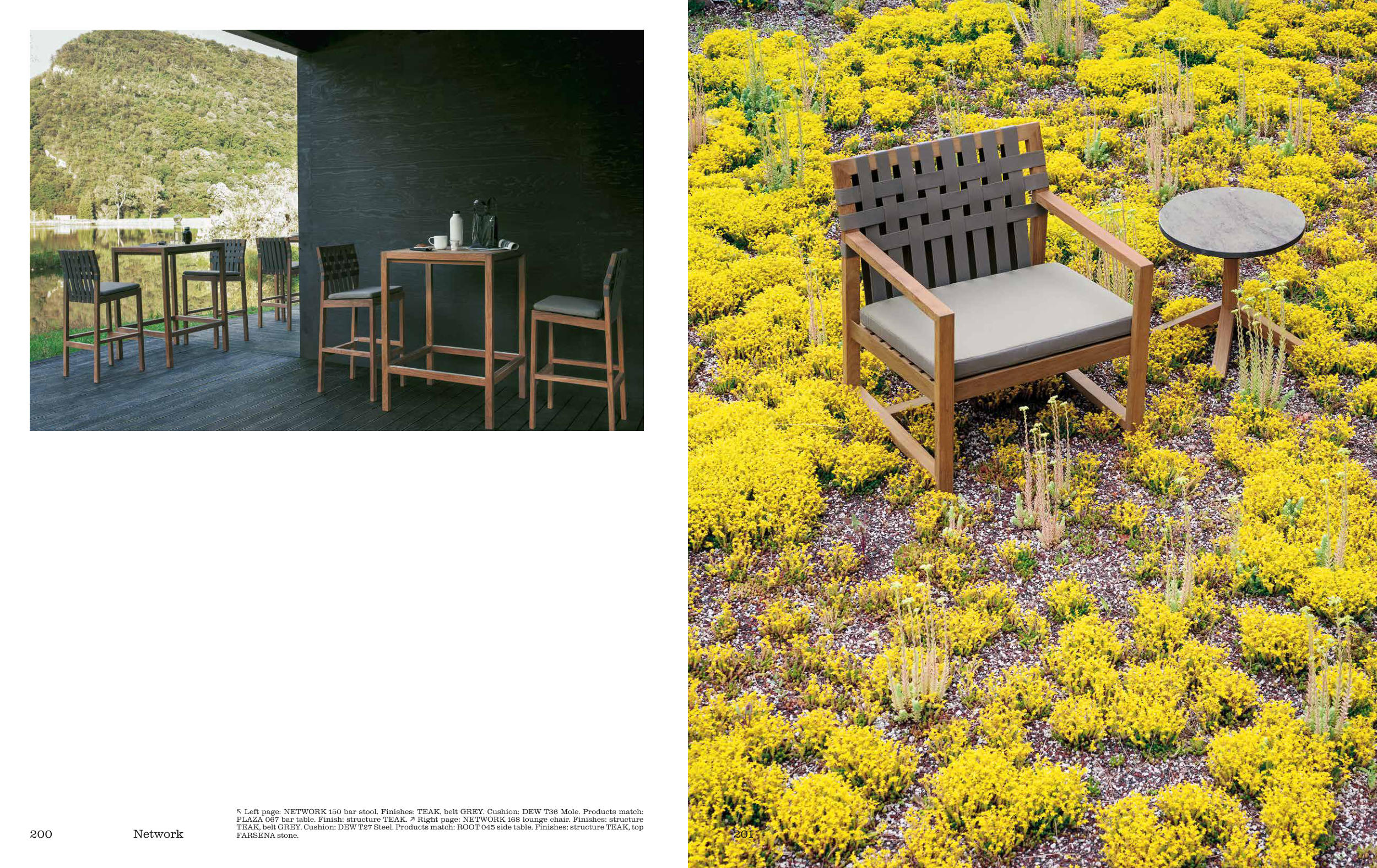 ↖ Left page: NETWORK 150 bar stool. Finishes: TEAK, belt GREY. Cushion: DEW T36 Mole. Products match:
