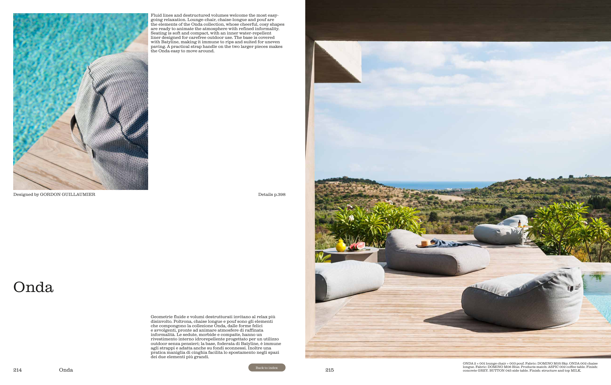 ONDA 2 × 001 lounge chair + 003 pouf. Fabric: DOMINO M05 Sky. ONDA 002 chaise