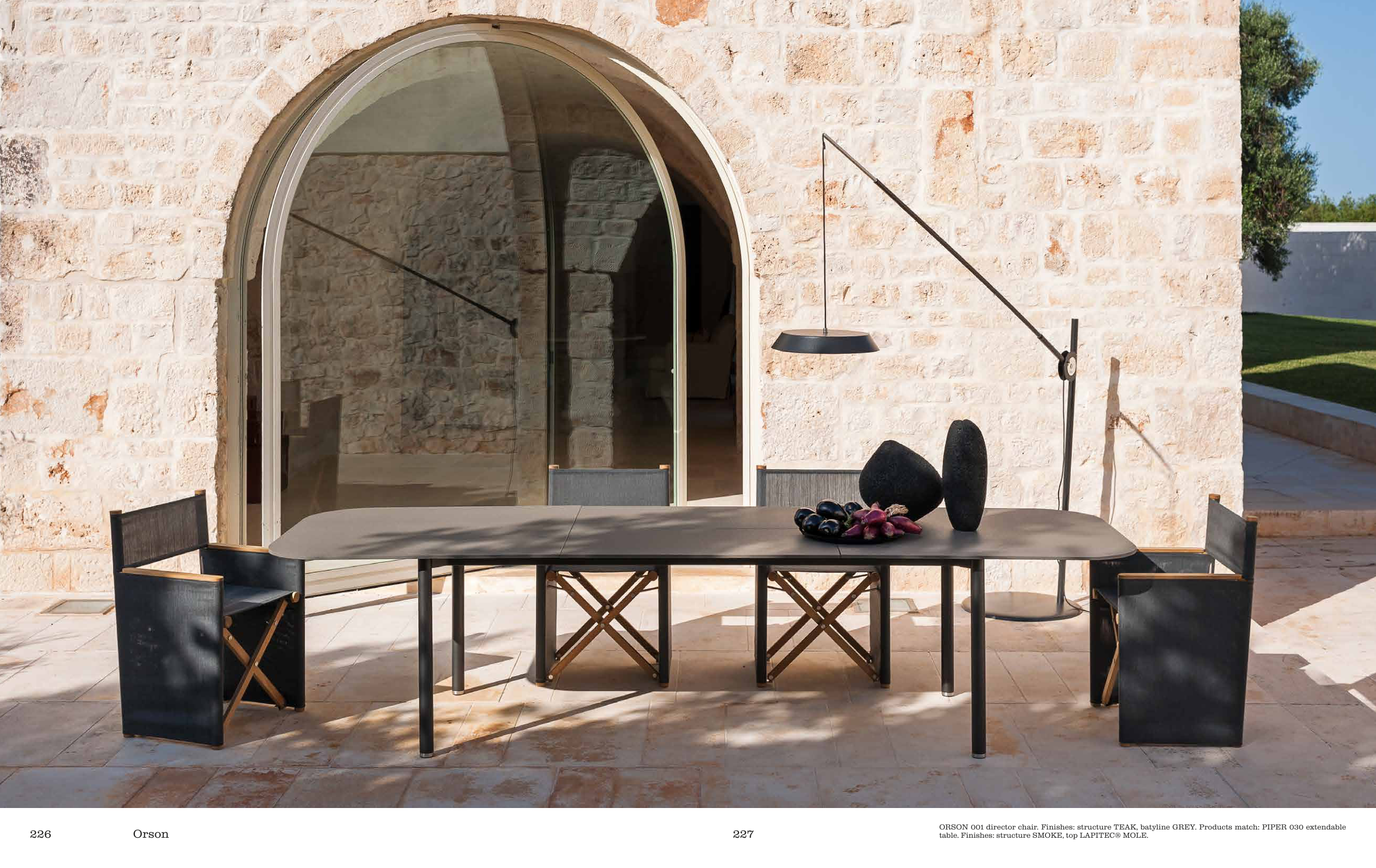 ORSON 001 director chair. Finishes: structure TEAK, batyline GREY. Products match: PIPER 030 extendable