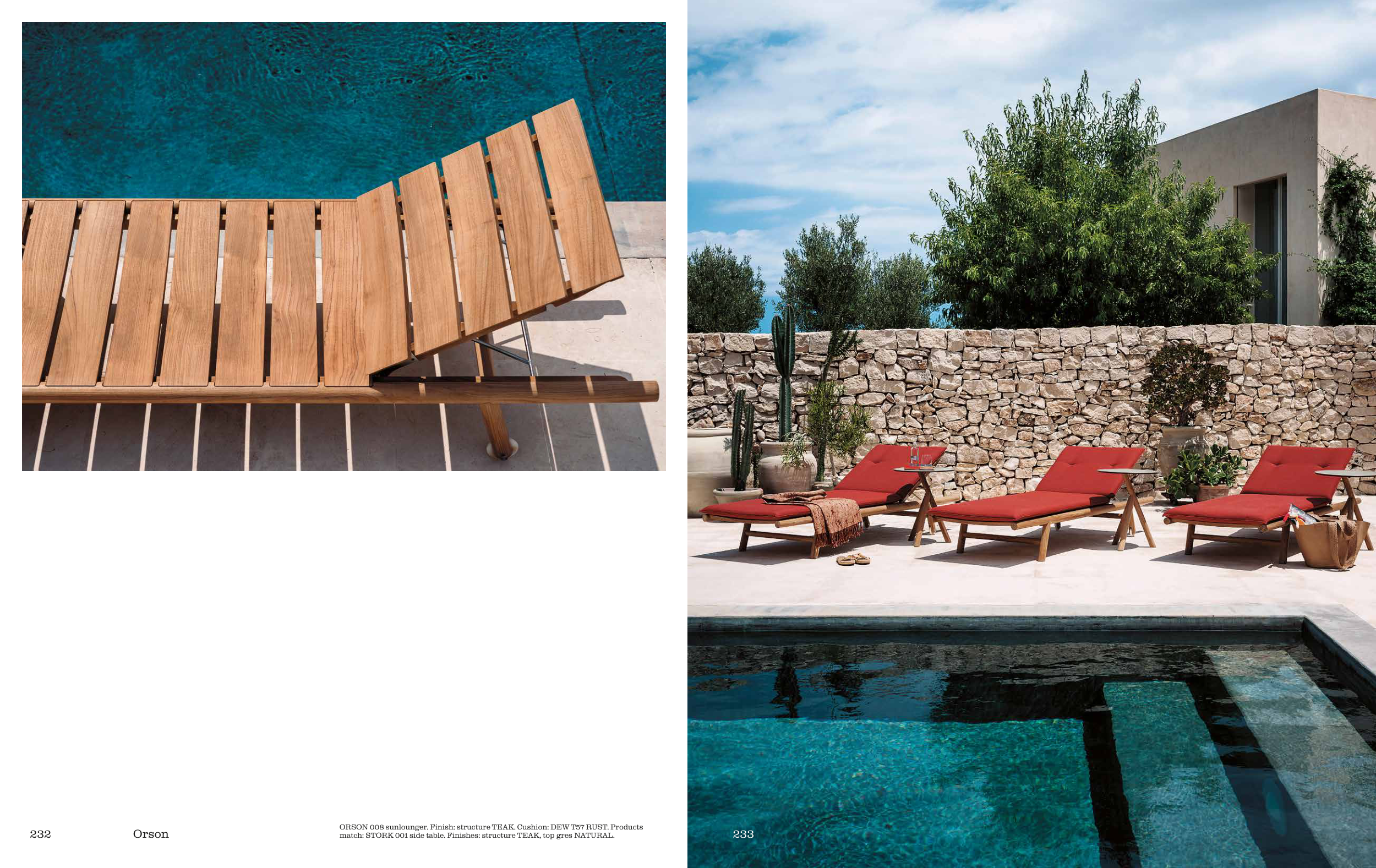 ORSON 008 sunlounger. Finish: structure TEAK. Cushion: DEW T57 RUST. Products