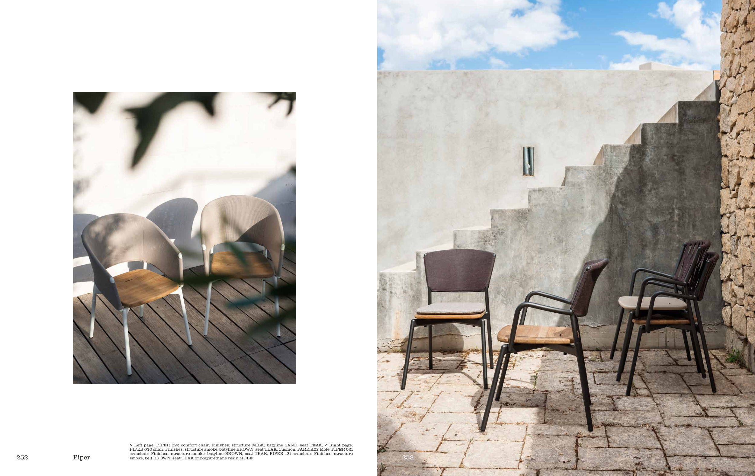 ↖ Left page: PIPER 022 comfort chair. Finishes: structure MILK; batyline SAND, seat TEAK. ↗ Right page:
