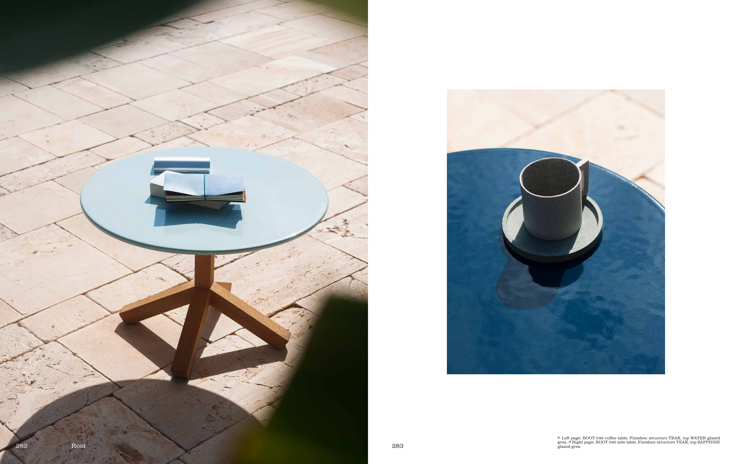 gres. ↗ Right page: ROOT 045 side table. Finishes: structure TEAK, top SAPPHIRE