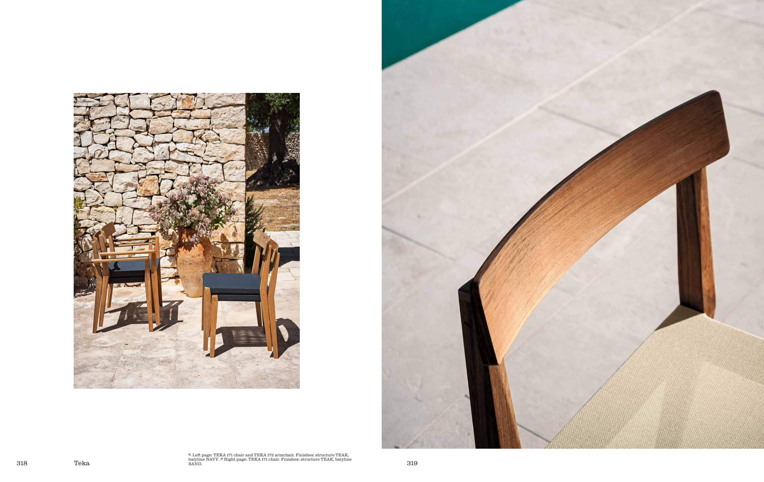 ↖ Left page: TEKA 171 chair and TEKA 172 armchair. Finishes: structure TEAK,