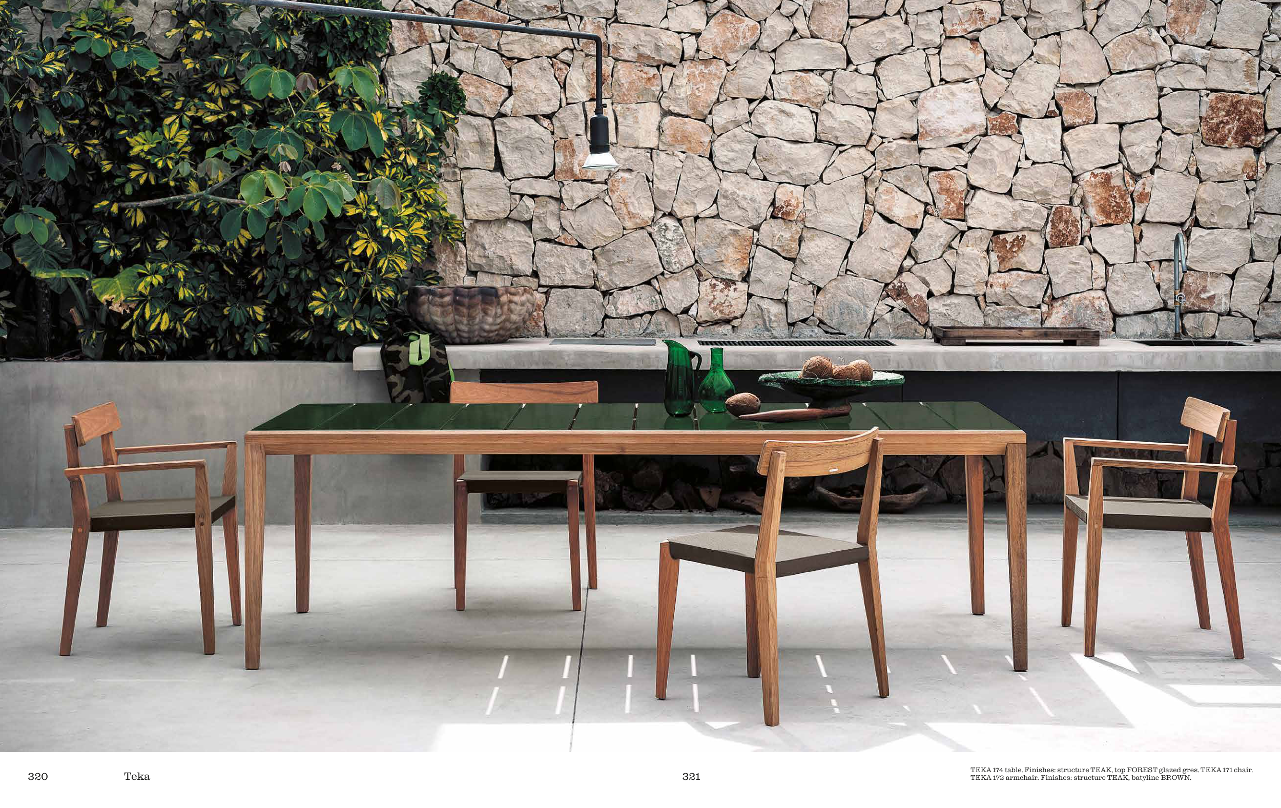 TEKA 174 table. Finishes: structure TEAK, top FOREST glazed gres. TEKA 171 chair.