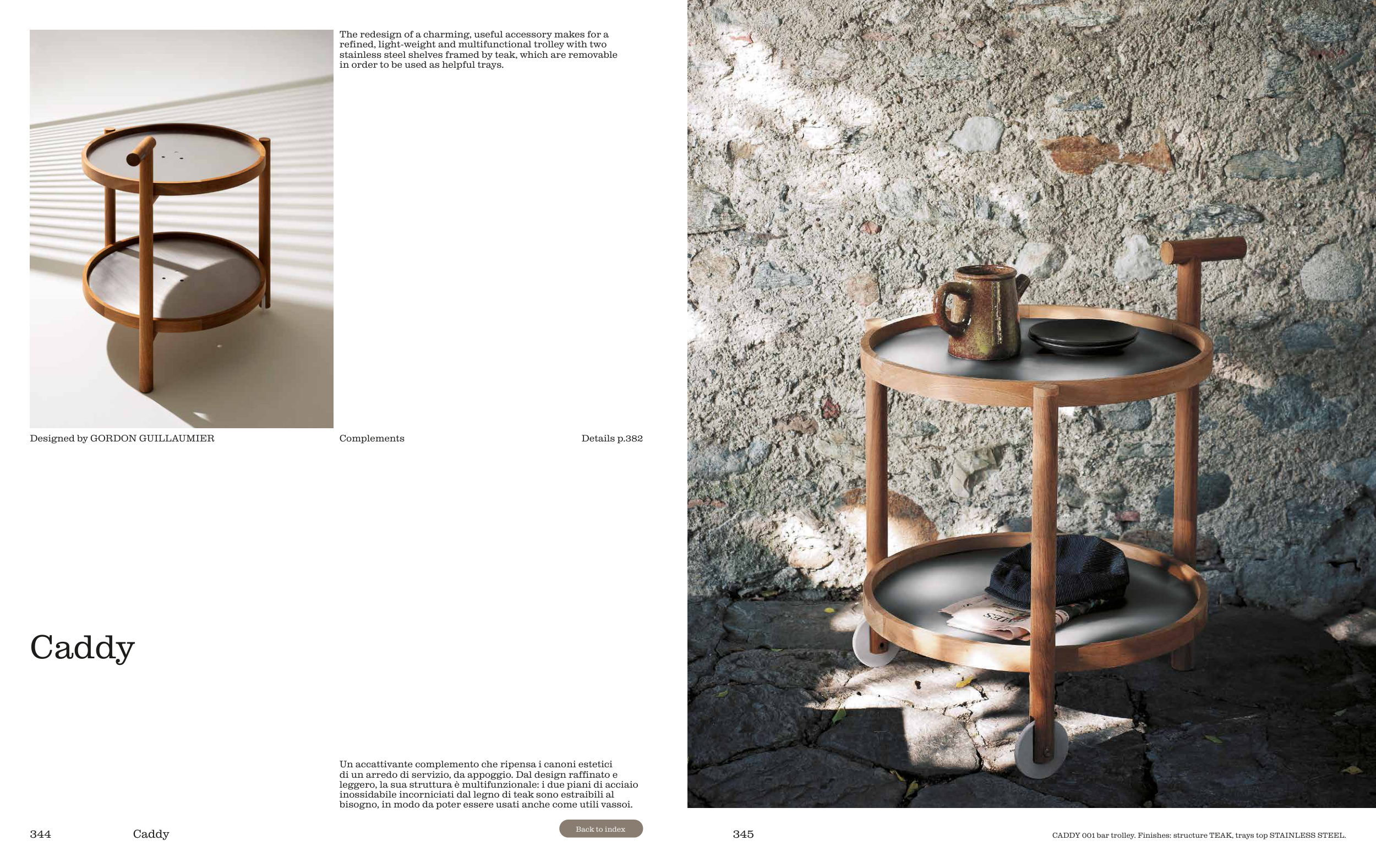 CADDY 001 bar trolley. Finishes: structure TEAK, trays top STAINLESS STEEL.