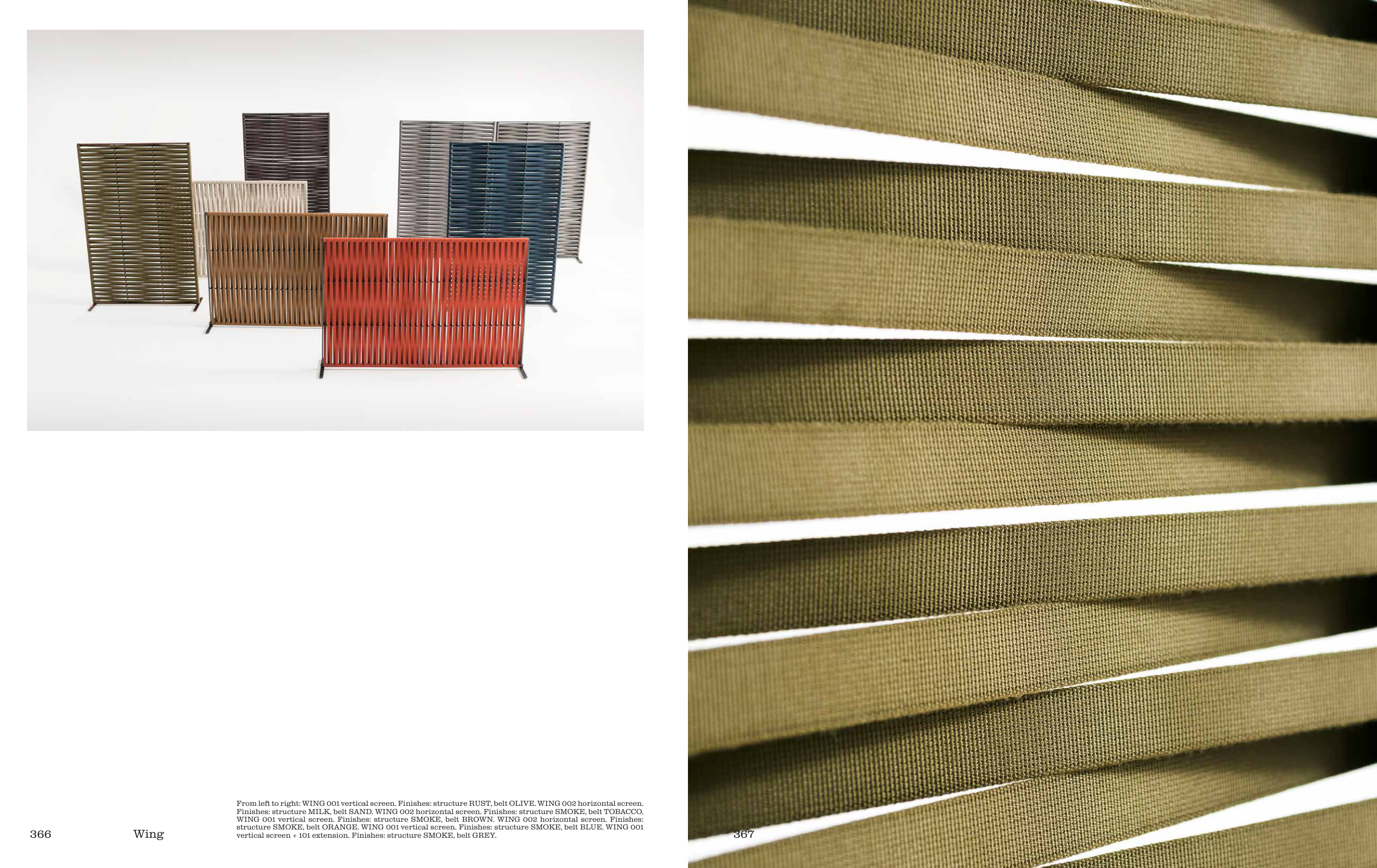 WING 001 vertical screen. Finishes: structure SMOKE, belt BROWN. WING 002 horizontal screen. Finishes: