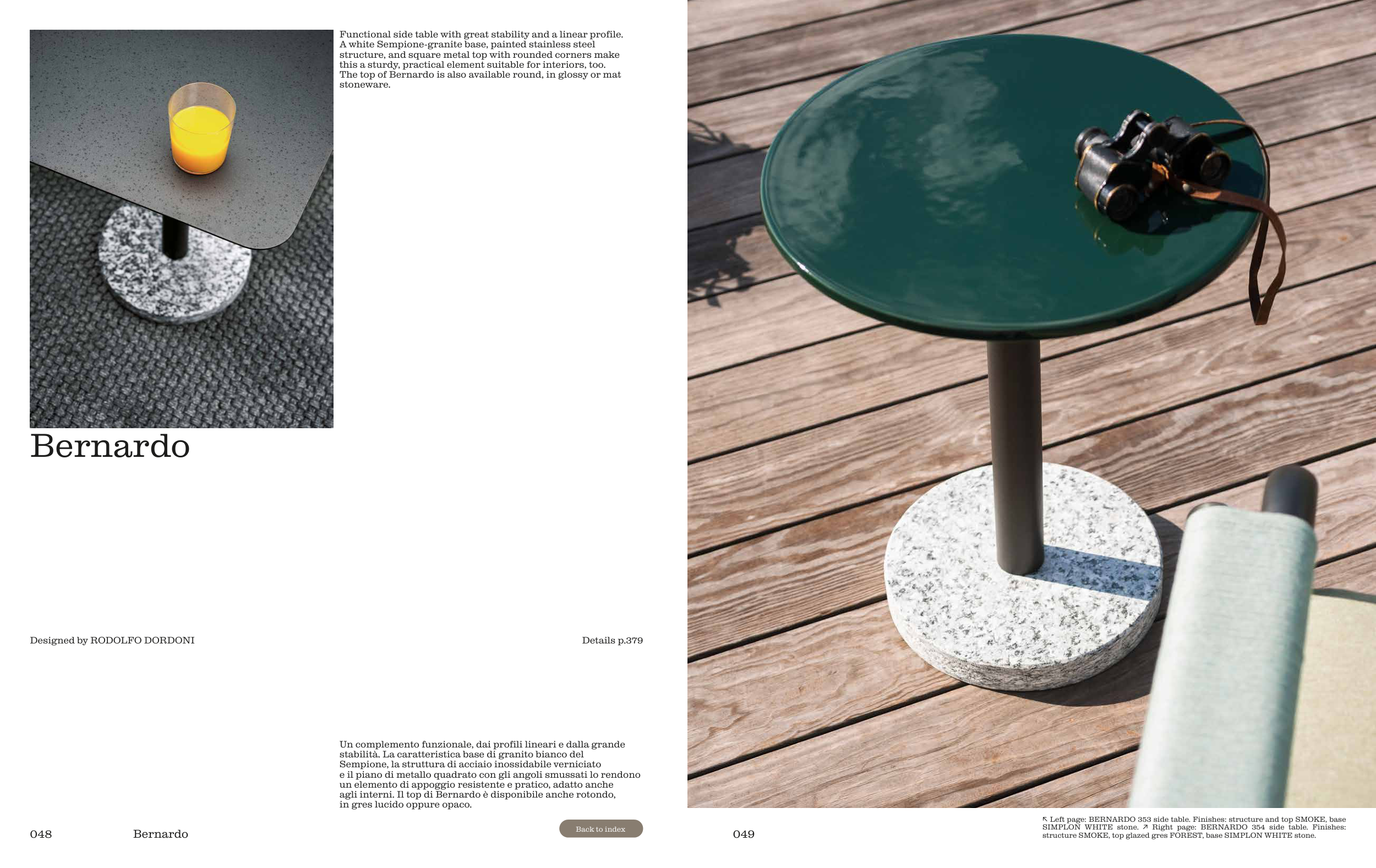 ↖ Left page: BERNARDO 353 side table. Finishes: structure and top SMOKE, base