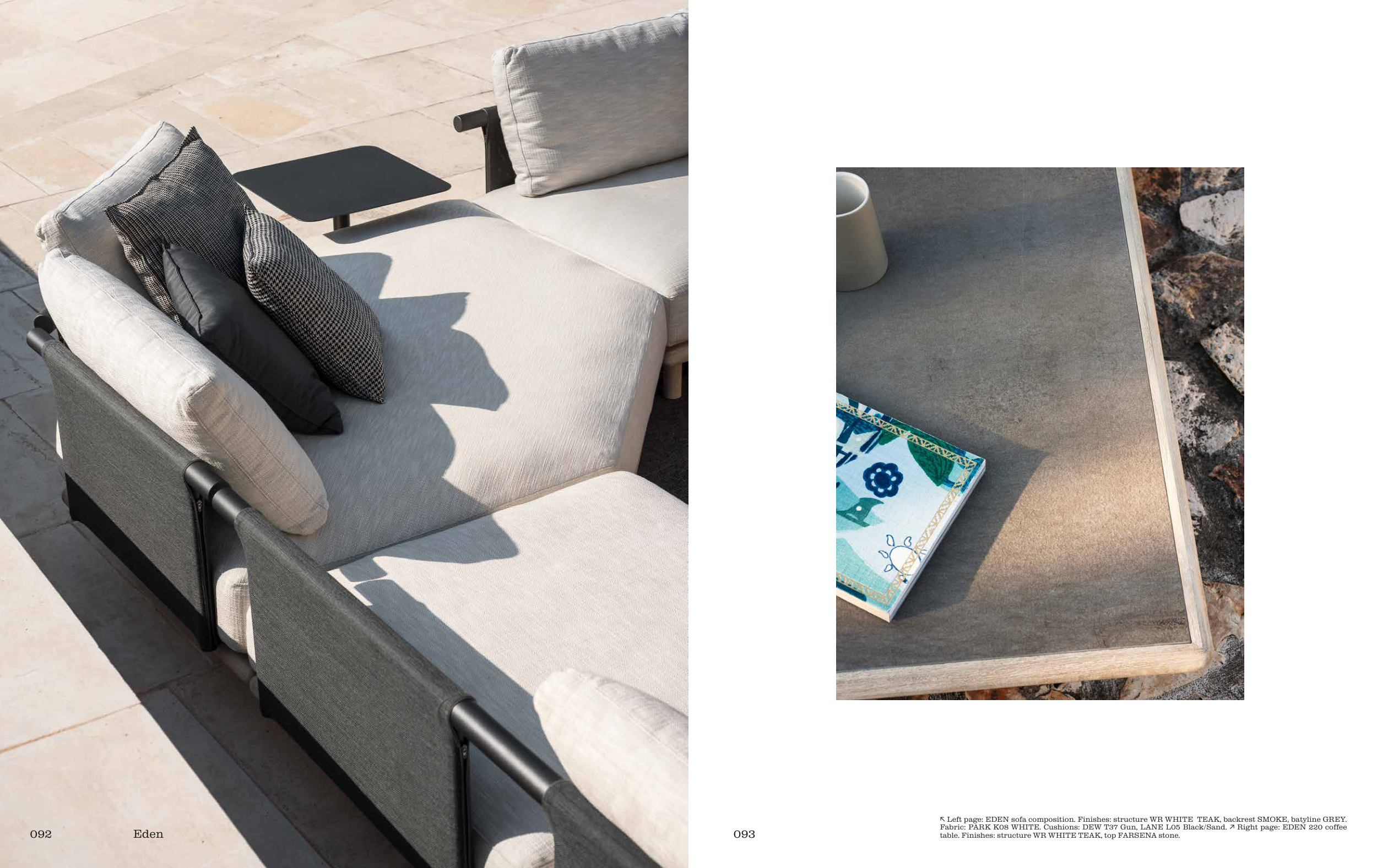 ↖ Left page: EDEN sofa composition. Finishes: structure WR WHITE TEAK, backrest SMOKE, batyline GREY.
