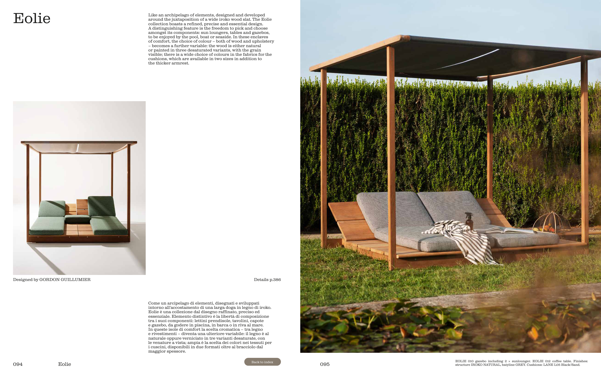 EOLIE 010 gazebo including 2 × sunlounger. EOLIE 012 coffee table. Finishes:
